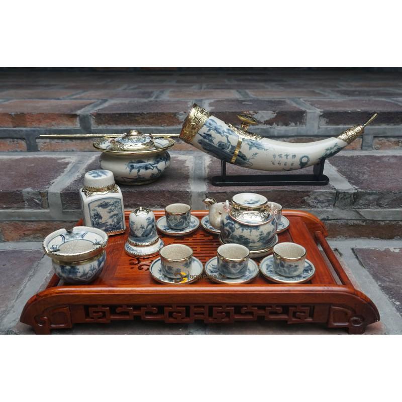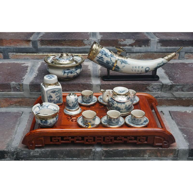 Bộ gồm: Bộ sản phẩm bao gồm: 1 ấm trà, 6 chén trà, 7 đĩa kê, 1 lọ đựng chè, 1 gạt tàn, 1 ống đựng tăm, 01 điếu bát, 01 điếu ngà