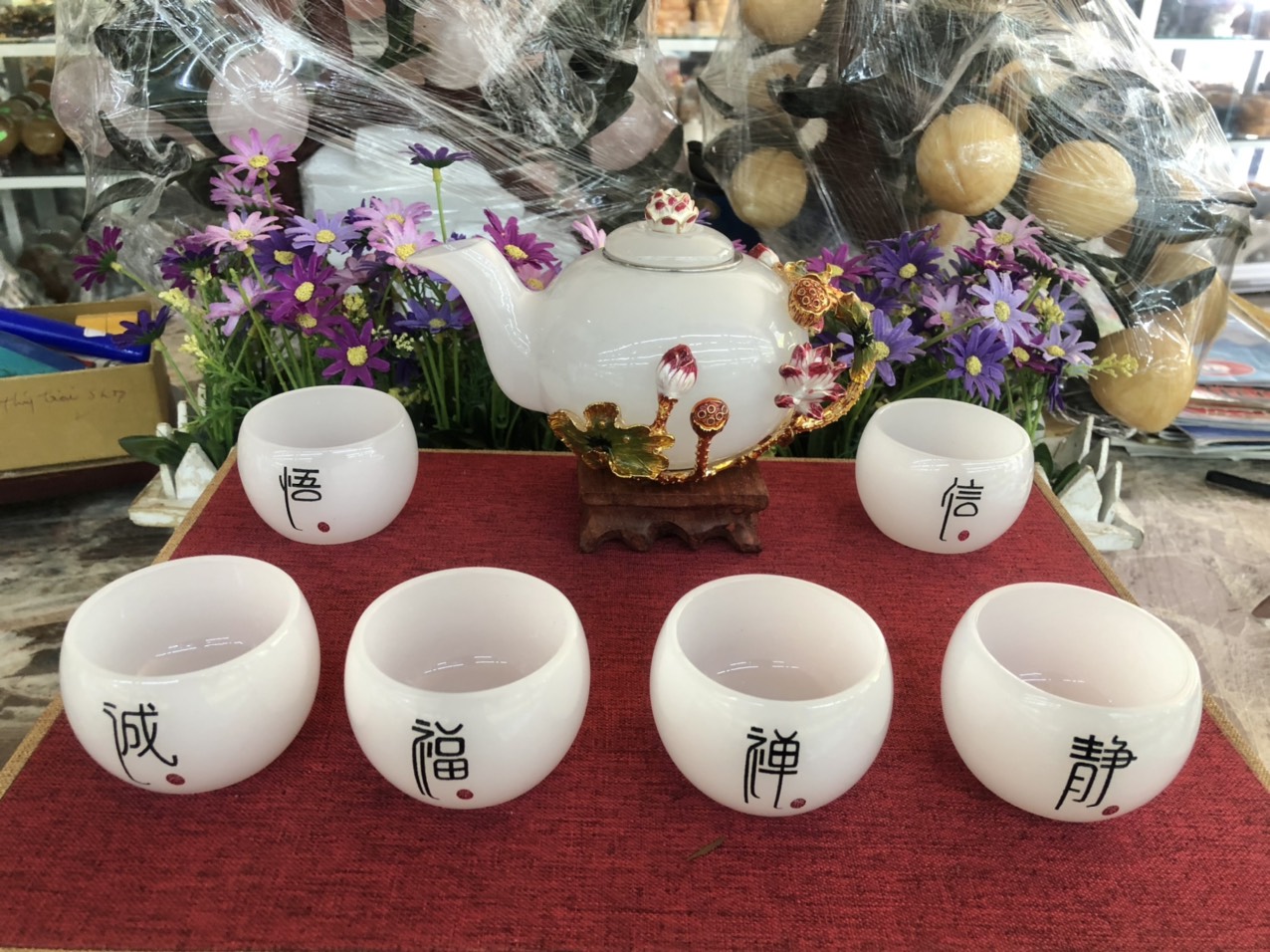 Chất liệu: Đá bạch ngọc Bao gồm: 01 ấm; 06 chén, 1 tách đựng nước thừa và hộp đựng cao cấp Kích thước : Dài 36 cm x 25 cm x 13 cm ( Bao