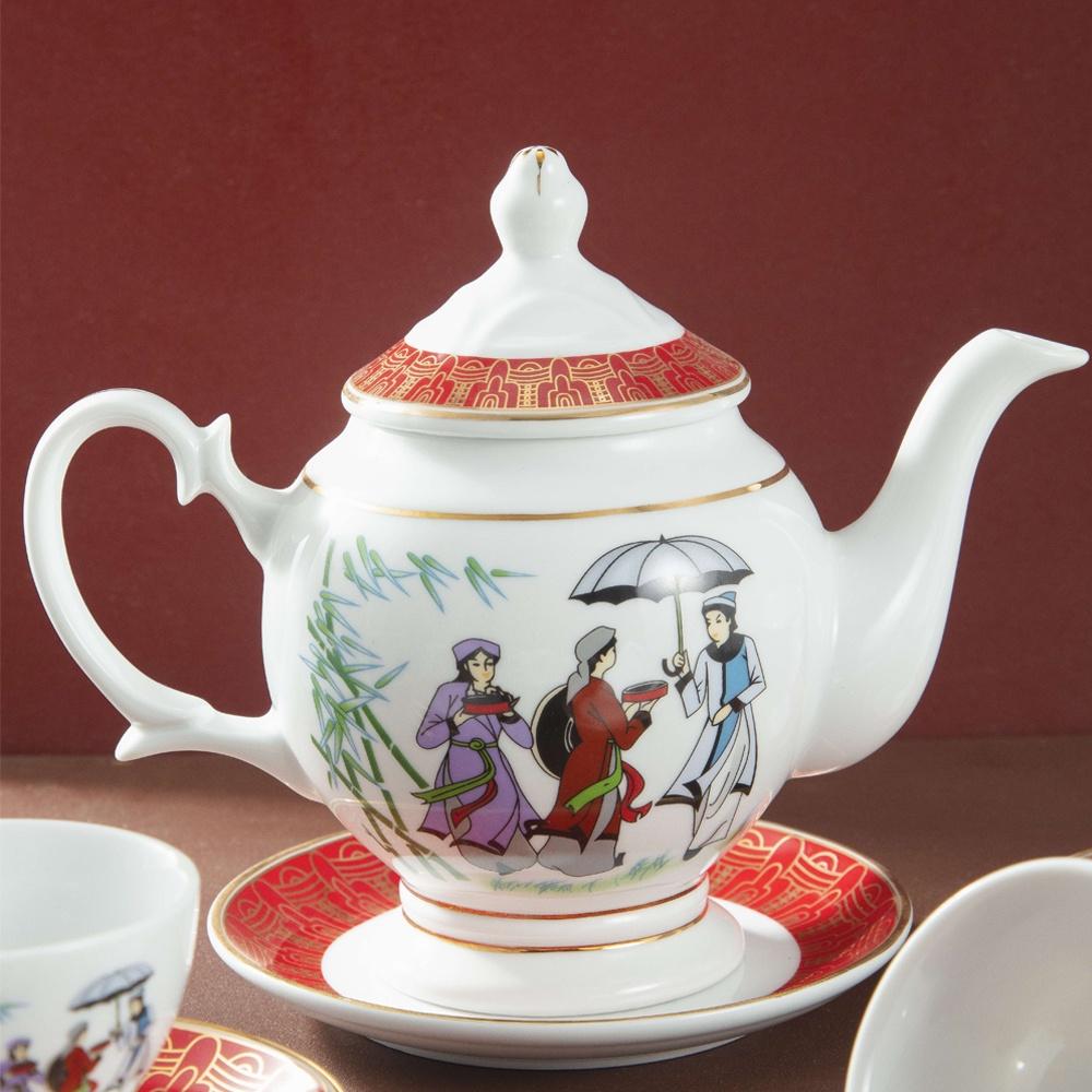 Một bộ sản phẩm bao gồm: 01 ấm, 01 đĩa ấm, 06 chén và 06 đĩa chén. Bộ sản phẩm được làm từ chất liệu gốm cao cấp, bảo đảm an toàn vệ sinh