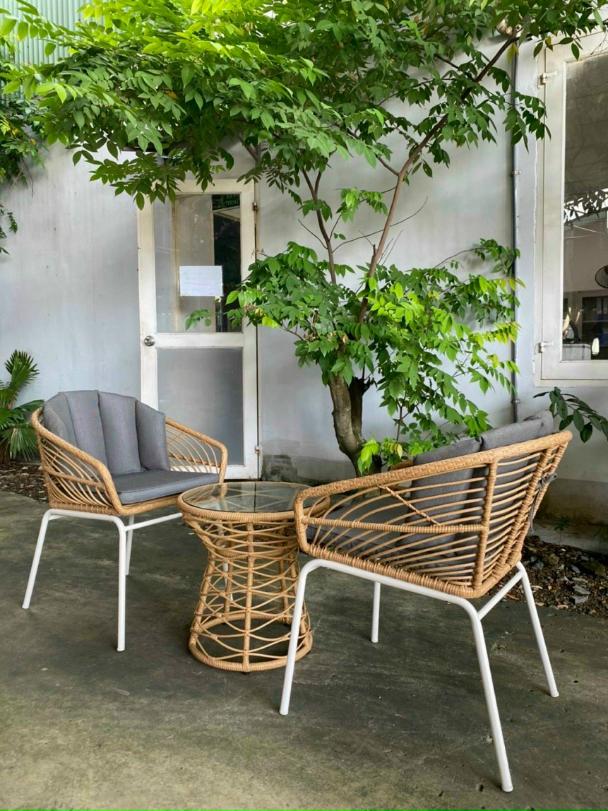 - Bàn ghế : Nhựa đan giả mây tre + Sử dụng trong nhà , ngoài trời