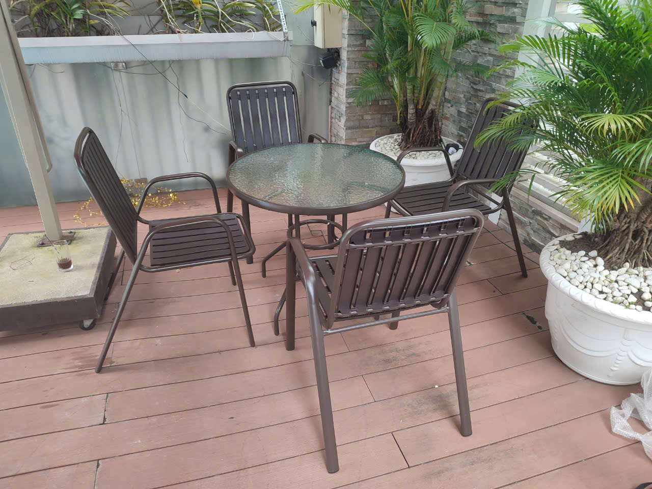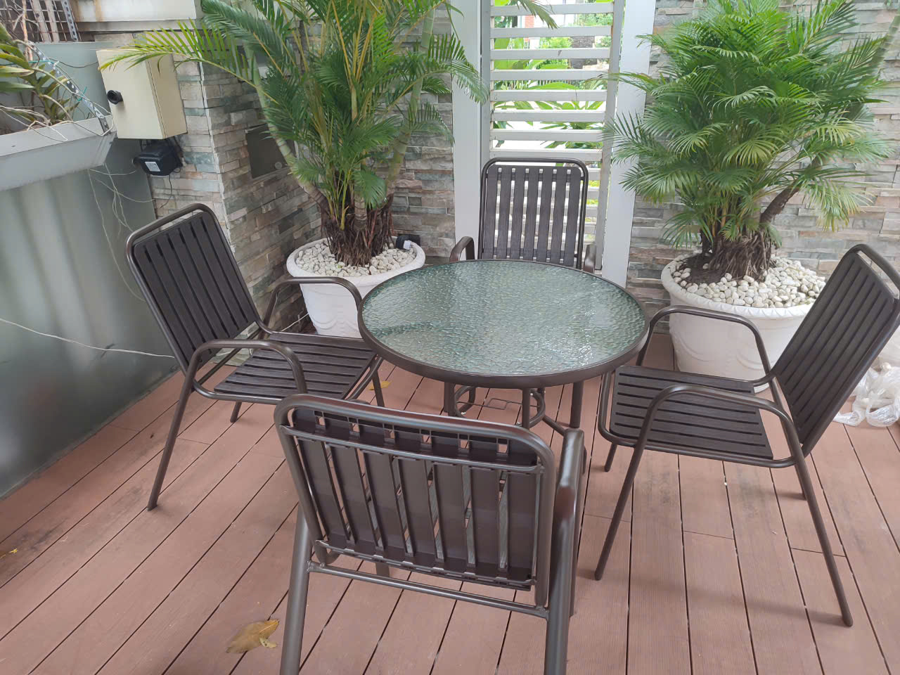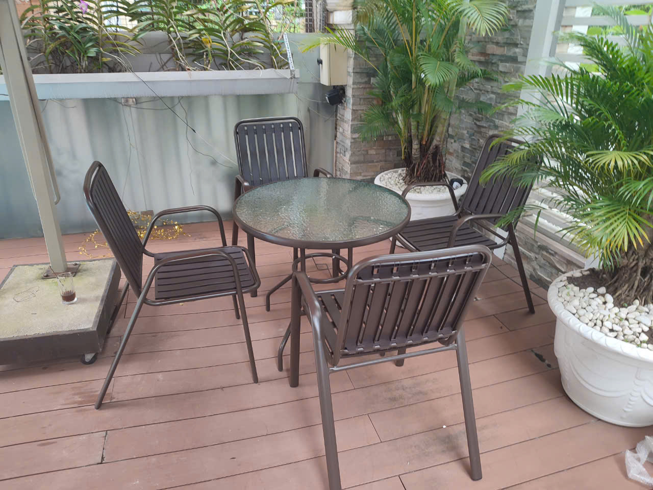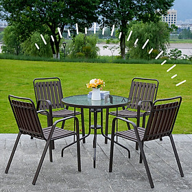 - Kích thước (DRC): Bàn: D800*H720mm/ Ghế: 520 x 510 x 840 (mm) Bộ Bàn Mặt Kính Cường Lực 4 Ghế Sắt Sân Vườn Giá Rẻ TE2020-08G/CC2032-T Bộ bàn 4 ghế sắt sân vườn TE2020-08G/CC2032-T được nhiều khách hàng lựa chọn, bởi bộ sản phẩm giá rẻ mà lại dùng rất bền khi để trực tiếp ngoài trời, chịu nắng mưa. Bạn có thể thoải mái bày trí bộ bàn ghế ở sân thượng, ban công chung cư, nhà phố, sân vườn, nhà hàng cafe outdoor,… Bàn Café Ngoài Trời Mặt Kính Tròn 80 Chân Sắt Nhập Khẩu TE2020-08G Thiết kế kiểu dáng tối giản dễ dàng kết hợp cùng nhiều kiểu ghế khác nhau, giúp cho gia chủ dễ dàng sắp xếp nội thất theo phong cách cá nhân. Bàn tiếp khách TE2020-08G với thiết kể nhỏ gọn cùng phần khung được làm từ sắt sơn tĩnh điện đen chắc chắn, chịu lực tốt, bền đẹp theo thời gian, có thể dùng được cả trong nhà và ngoài trời. Mặt kính cường lực bền đẹp có hoa văn chìm nổi ở mặt dưới tạo hiệu ứng thị giác thú vị cho người nhìn. Đường kính 80cm rộng rãi sử dụng 4 ghế. Ghế Cafe Ngoài Trời Có Tay Chịu Nắng Mưa Nhập Khẩu CC2032-T Mặt ngồi và lưng ghế được gia công từ nhựa PP họa tiết vân gỗ chuyên dùng cho ngoài trời, có khả năng chống thấm, chịu nhiệt cực tốt. Các thanh gỗ nhựa xếp song song cách nhau một khoảng đồng đều nhằm điểm nhấn riêng, tăng tính thẩm mỹ, đồng thời là chỗ thoát nước dễ dàng khi có mưa. Khung sắt sơn tĩnh điện thanh mảnh nhưng chịu lực rất tốt, phù hợp với đa dạng vóc dáng người ngồi. Ghế ngoài trời có tay vịn tạo điểm tựa thoải mái dễ chịu. Hình thực tế: