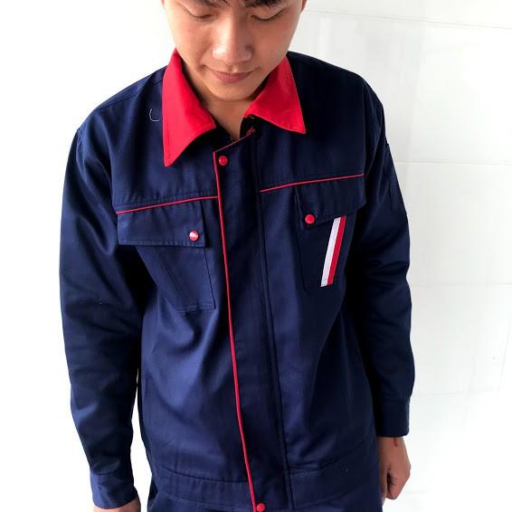 Áo được may phối màu ở phần cổ áo, vai áo và đường phối viền ở ngực áo Áo có hai túi to trước ngực có nắp đậy, có khóa kéo tiện dụng. Áo cài cúc có nẹp che cúc, có bo tay và bo đai hông, túi gài bút bên tay trái Quần được may theo dáng đứng, đai quần kết hợp thun co giãn 2 bên hông và thắt lưng với hai túi chéo to thoải mái, 1 túi hậu sâu và hai túi hộp ở đùi đáp ứng nhu cầu để đồ và sử dụng của công nhân cũng như các kỹ sư khi tham gia làm việc Cách chọn size: Size S: thích hợp cho nam từ Size M: thích hợp cho nam từ 1.63m đến 1.73m, nặng từ 54-65kg Size L: thích hợp cho nam từ 1.70m đến 1.78m, nặng từ 63-70kg Size XL: thích hợp cho nam từ 1.75m đến 1.85m, nặng từ 70-80kg