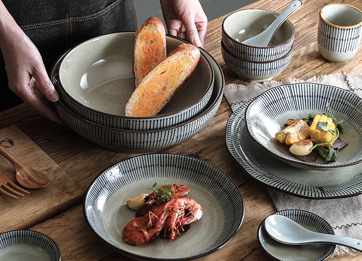 Bộ Bát Đĩa Gốm Sứ Hoa Văn Lá Dọc Phong Cách Nhật Bản Họa Tiết Thổ Cẩm, Thiết Kế Sang Trọng