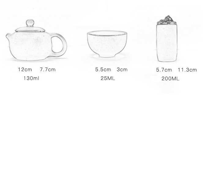 - Một bộ gồm một túi đựng, một ấm và bốn chén. - Ấm có kích thước: rộng 9cm cao 6,5 cm. - Chén có đường kính 6,5cm cao 3,2cm.kích thước 11,5cm x 18,5 cm