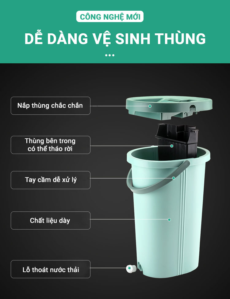 • Thùng 2 ngăn : 1 ngăn vắt khô tự động - 1 ngăn chứa nước để giặt cây lau