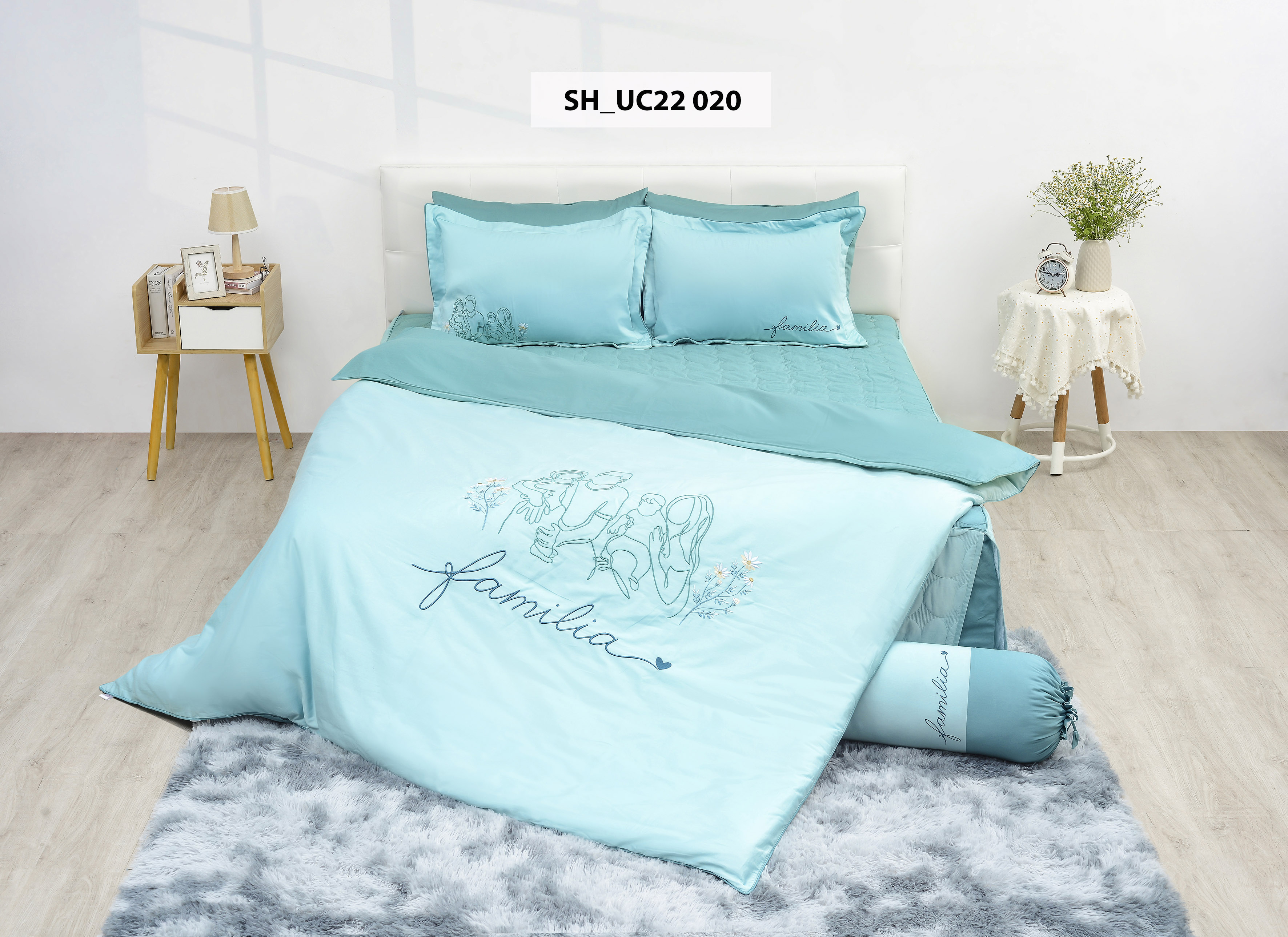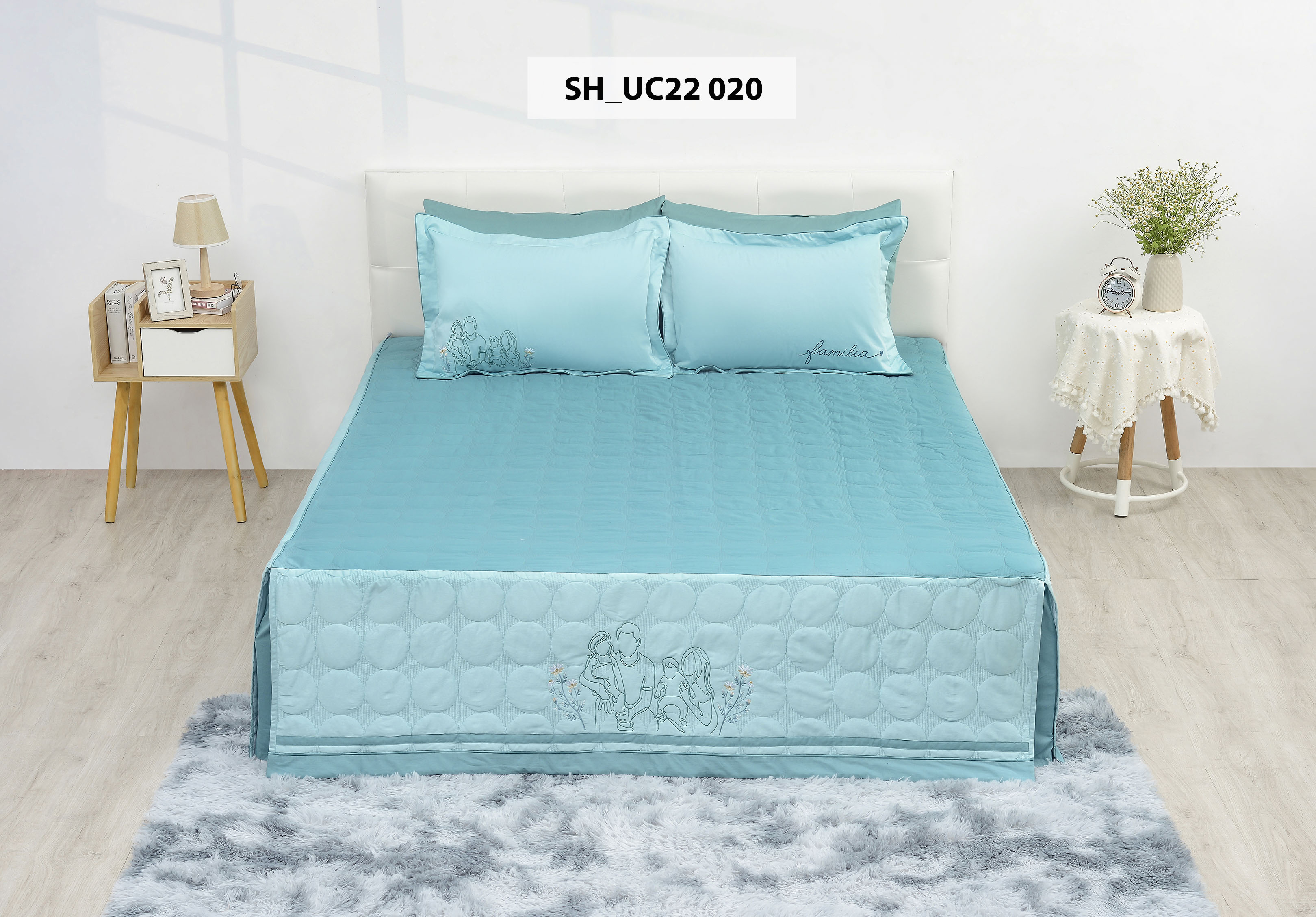 - Màu sắc:Tươi sáng,trẻ trung ,hiện đại được thiết kế với các họa tiết thêu tinh tế nhẹ nhàng và sang trọng. Bộ sản phẩm cao cấp Urban collection là làn gió mới cho căn phòng đầy yêu thương thoải mái hướng đến giấc ngủ xanh và hoàn hảo sau một ngày dài với công việc.Sự đa dạng về kiểu dáng, chất liệu, kích thước đến màu sắc mang lại nhiều lựa chọn cho gu thẩm mỹ của mỗi khách hàng.Với những cải tiến cập nhật và ứng dụng xu thế thiết kế mới nhất,không gian phòng ngủ của bạn không chỉ sang trọng ,đẳng cấp mà còn tràn ngập sự ấm áp yêu thương. UC22 020: Bộ chăn ga gối Sông Hồng UC22 020 mang lại tình yêu thanh khiết đầy lãng mạn cho chủ nhân. Sản phẩm rất phù hợp với phòng cưới, phòng ngủ của các cặp đôi mong muốn tình yêu lâu bền, thủy chung. Thiết kế sử dụng tone màu xanh nhẹ nhã nhặn kết hợp họa tiết thêu hình ảnh cả gia đình vui vẻ, đầm ấm, với dòng chữ Familia, thể hiện một cách tinh tế bằng công nghệ in nổi hiện đại. HƯỚNG DẪN SỬ DỤNG:
