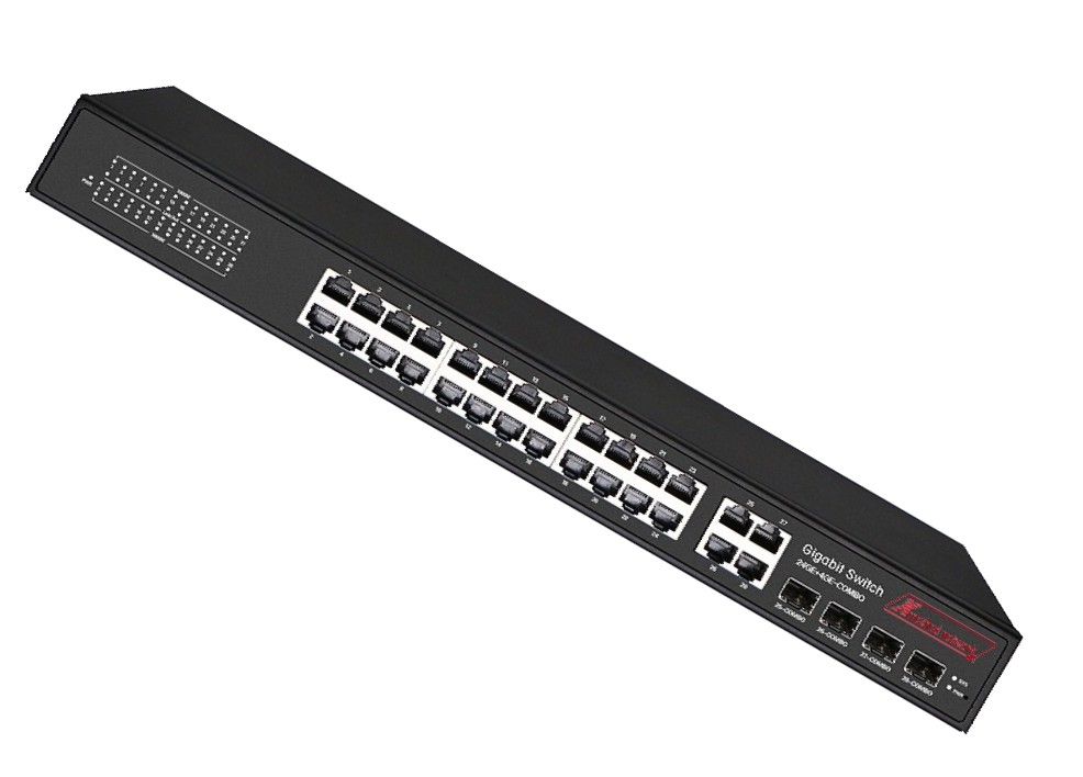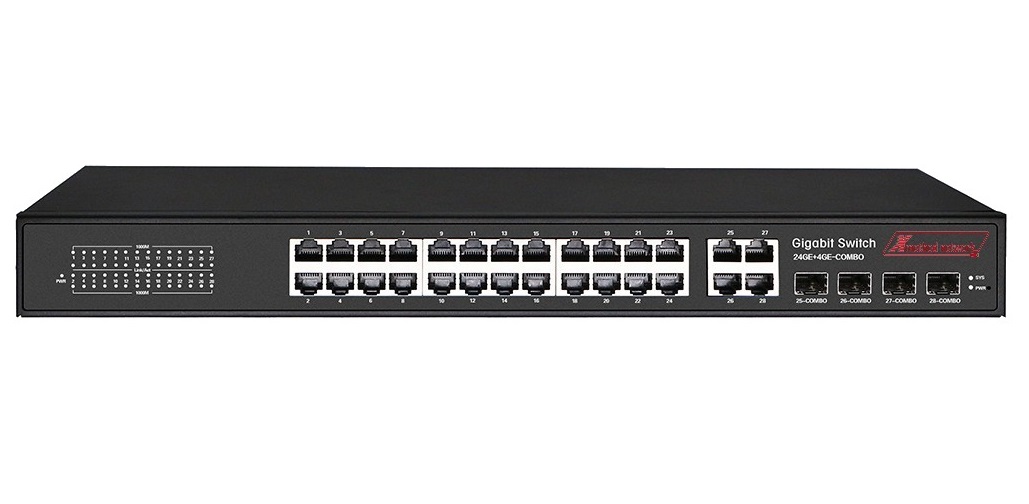 28-port unmanaged Gigabit Ethernet Switch, 24-port PoE, 4 Gigabit combo