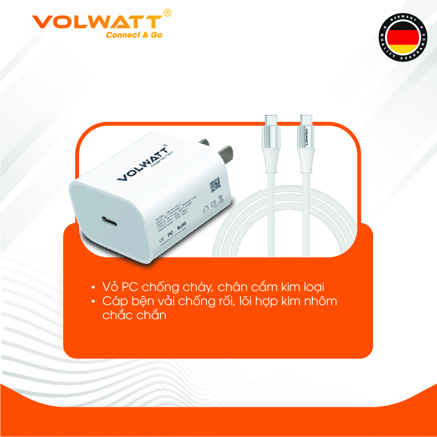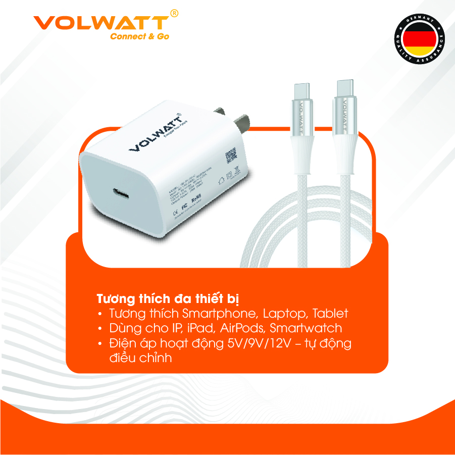 ✨Bộ củ cáp sạc nhanh Volwatt GE-20-SCC 20W hàng chính hãng | Adapter PD Type-C + Cáp Type-C to Type-C 60W, dài 1m – BH 12 tháng