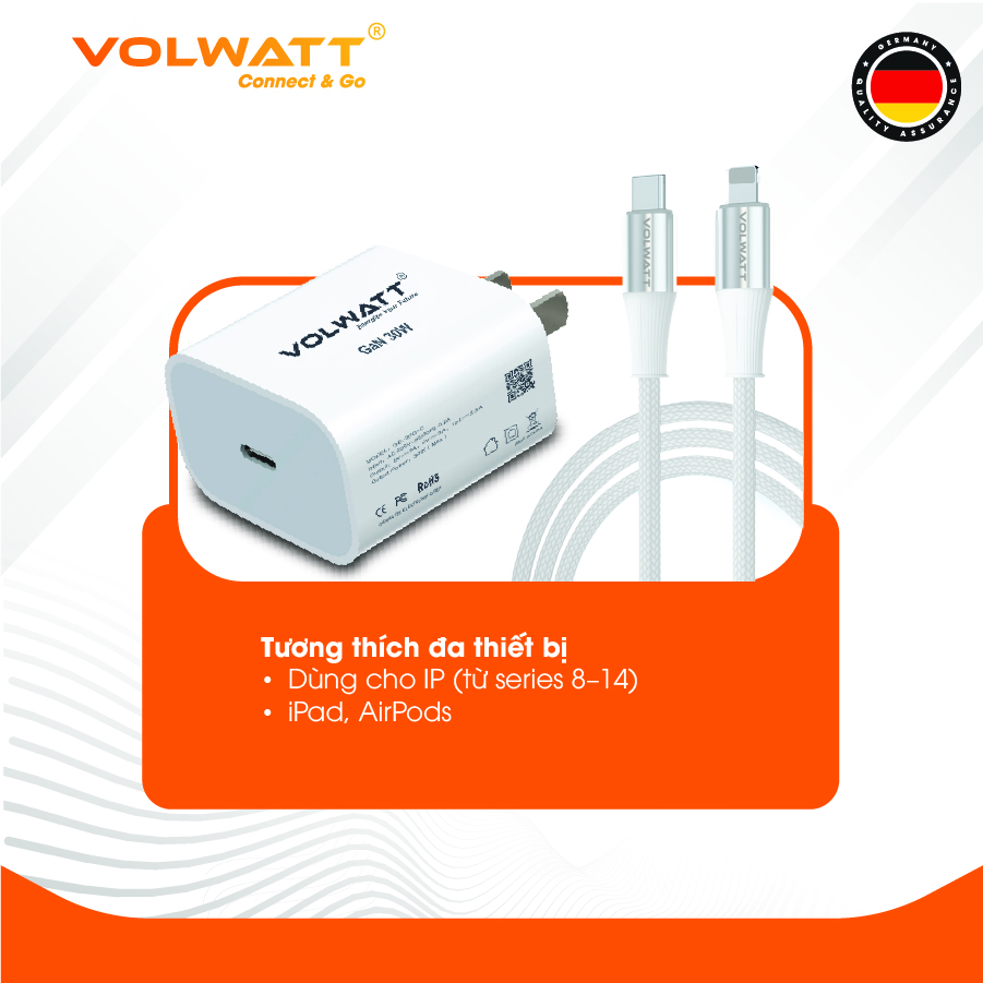 ✨Bộ củ cáp sạc siêu nhanh Volwatt GE-30-SCL 30W GaN hàng chính hãng | Adapter PD Type-C + Cáp Type-C to L 1m, BH 12 tháng