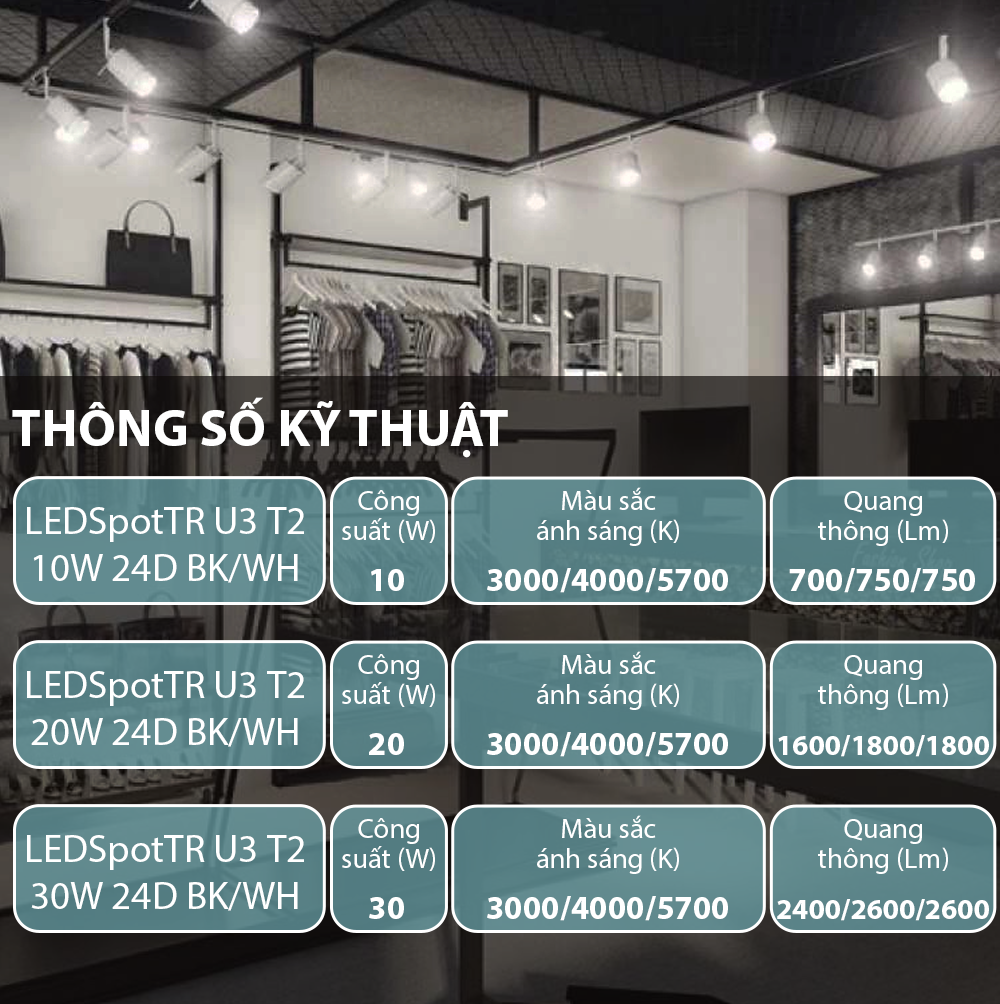 LEDSpotTR-U3 T2 10W 24D 10W 700/750/750lm 80 3000/4000/5700K Trắng/Đen