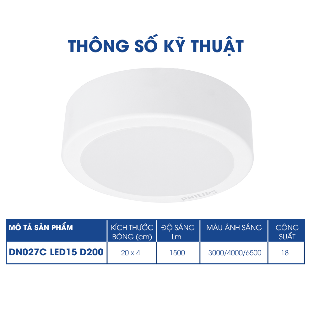 Model: D LN10L 220/18W Công suất: 18 W Điện áp: 220 V/50 Hz Màu ánh sáng: Trắng Quang thông: 1500 lm Kích thước (DXRxH): (220x220x18)mm NGUYÊN TẮC ĐÈN HOẠT ĐÔNG: Đèn tích hợp cảm biến