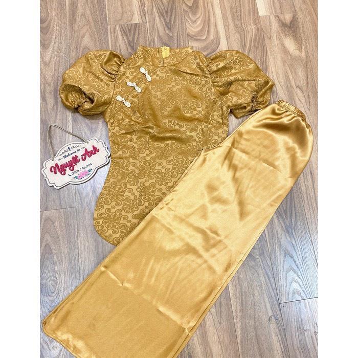 - Áo thiết kế cổ trụ tay phồng trang trọng kính đáo họa tiết gấm nổi sang trọng