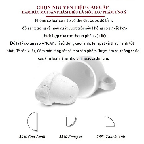 Cao lanh (đất sét trắng), fenspat và thạch anh là nguyên liệu thô tạo nên sứ Ancap. Đồng thời, sứ được nung ở 1410 ° C nên có những đặc tính kỹ thuật chất lượng cao: