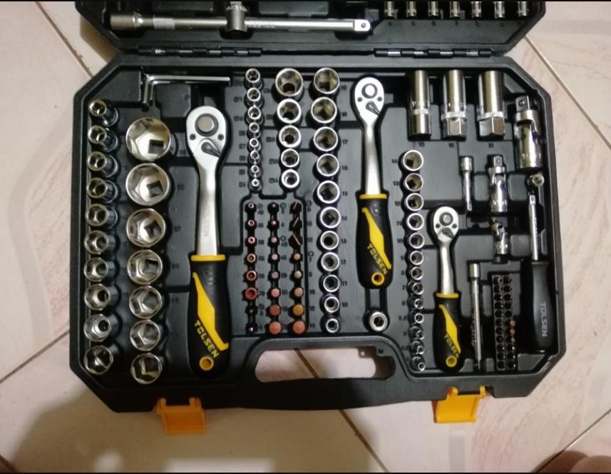Bộ dụng cụ cầm tay 168 món Bao gồm: 1 búa nhổ đinh 8Oz 1 kìm kết hợp 7" 1 kìm mũi dài 6" 1 kìm bơm 10" 1 kìm tuốt dây 8,5" 1 tua