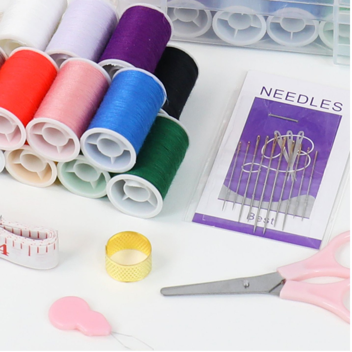 - Bộ sản phẩm bao gồm: 16 cuộn chỉ màu, 01 thước dây, 01 kéo cắt chỉ , 01 túi kim may đủ kích cỡ khác nhau trong hộp, 01 dụng cụ hỗ trợ xỏ kim,...