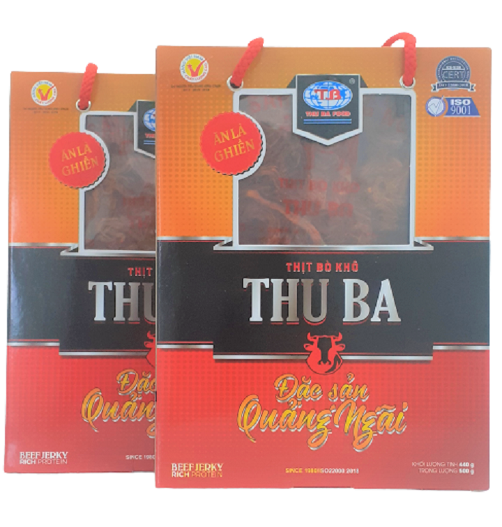BÒ KHÔ THU BA là món đặc sản Quảng Ngãi, đạt tiêu chuẩn ISO 22000 và là Hàng Việt Nam Chất Lượng Cao do Người tiêu dùng bình chọn từ 2017 đến 2024 Sản phẩm được sản
