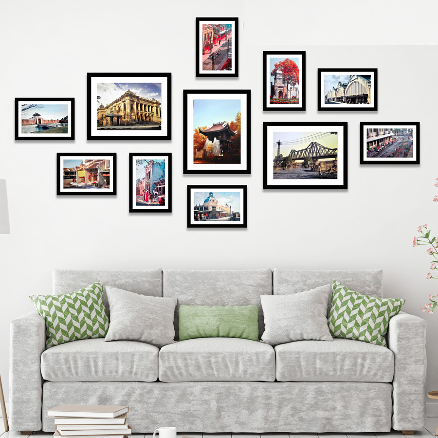 Kích Thước Bộ Khung gồm: 3 khung 20x25cm, 8 khung 13x18cm (Tổng kích thước sau khi treo khoảng 145x70cm)