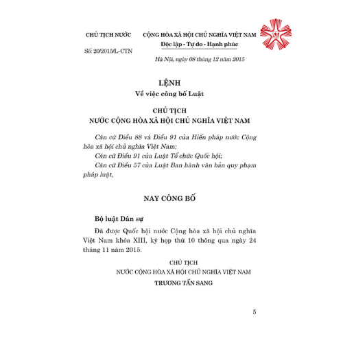 Bộ luật Dân sự số 91/2015/QH13 được thông qua ngày 24-11-2015 tại kỳ họp thứ 10 Quốc hội nước Cộng hòa xã hội chủ nghĩa Việt Nam khóa XIII, thay thế Bộ luật Dân sự