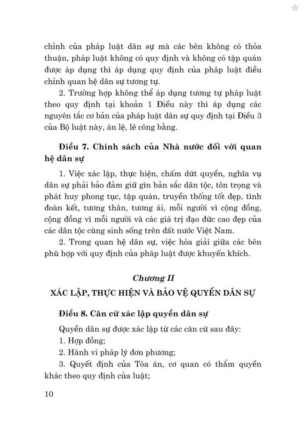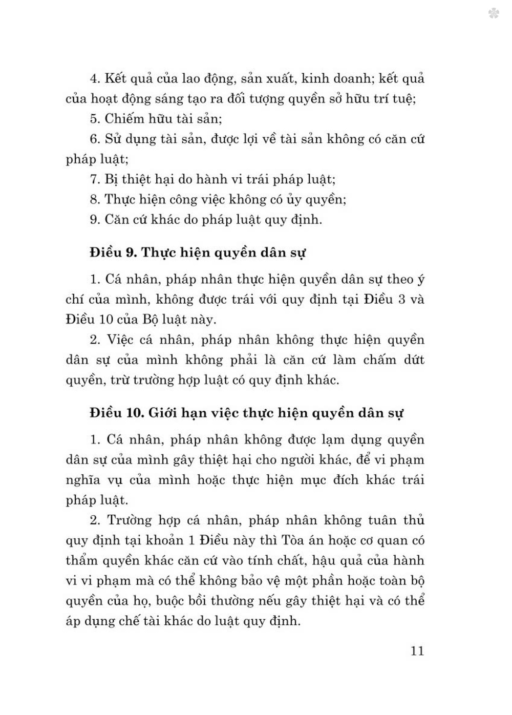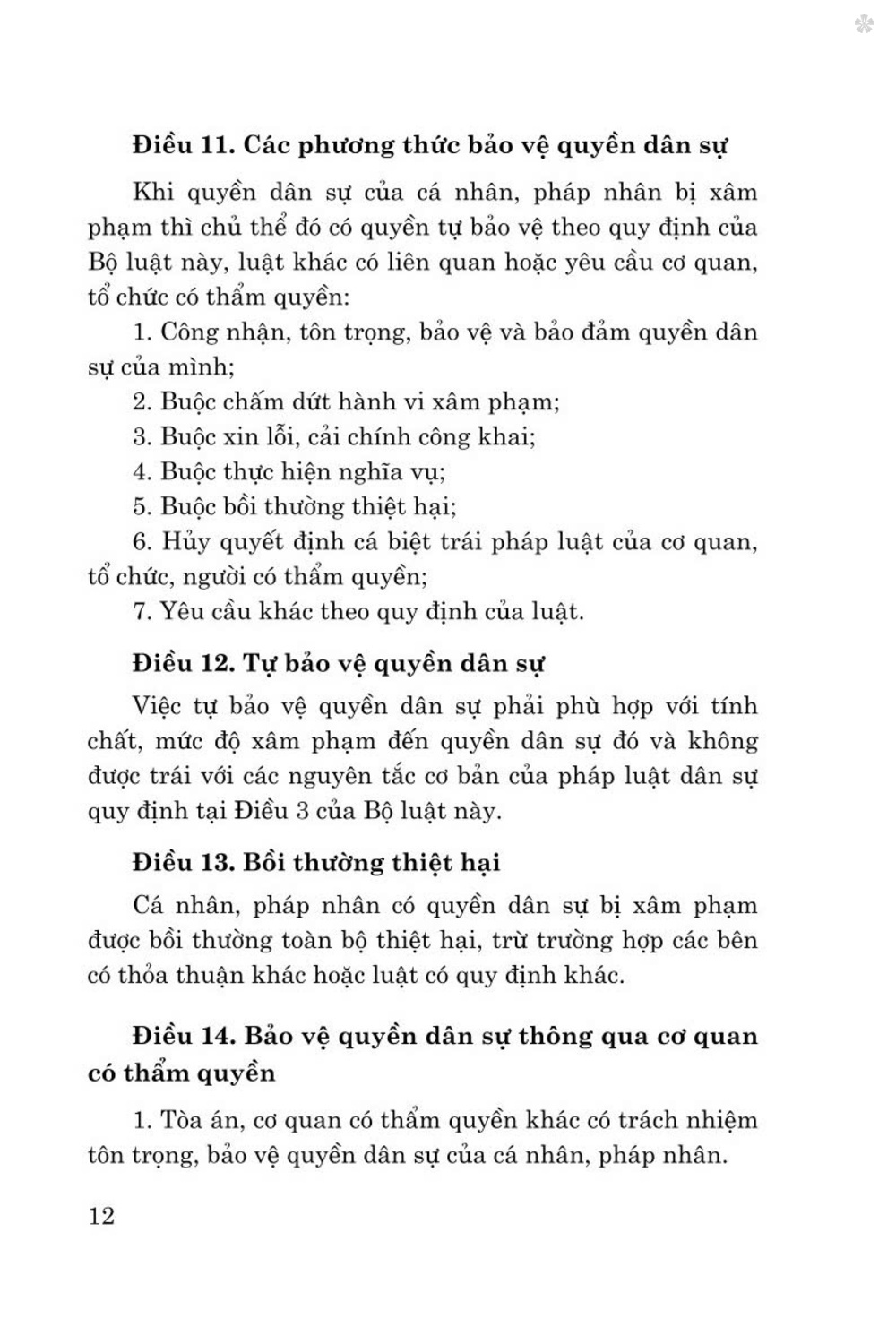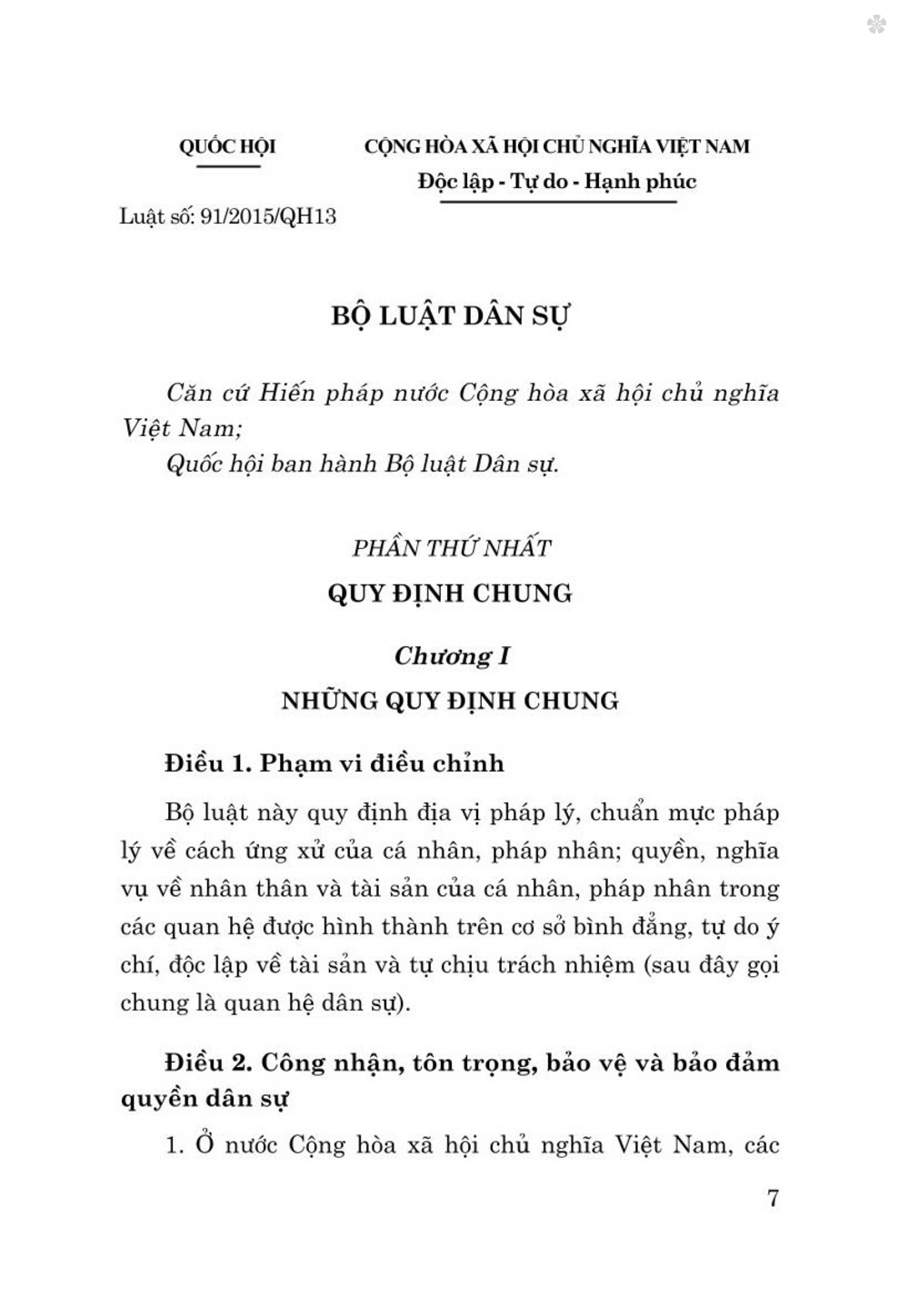 Mua tại TiktokBộ luật Dân sự năm 2015 quy định địa vị pháp lý, chuẩn mực pháp lý về cách ứng xử của cá nhân, pháp nhân; quyền, nghĩa vụ về nhân thân và tài sản của cá nhân, pháp nhân trong các quan hệ được hình thành trên cơ sở bình đẳng, tự do ý chí, độc lập về tài sản và tự chịu trách nhiệm. Bộ luật thể hiện sự thay đổi mạnh mẽ trong tư duy của các nhà làm luật với nhiều quy định mới mang tính đột phá từ kết cấu, kỹ thuật lập pháp với nhiều nội dung mới so với Bộ luật Dân sự năm 2005 theo từng chế định như: tài sản, thừa kế, bồi thường thiệt hại...