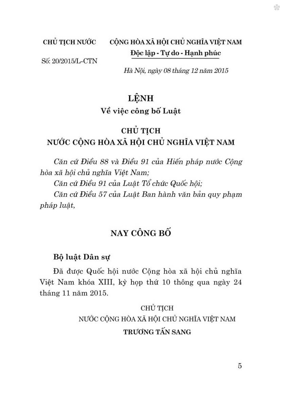 Bộ luật Dân sự số 91/2015/QH13 được thông qua ngày 24-11-2015 tại kỳ họp thứ 10 Quốc hội nước Cộng hòa xã hội chủ nghĩa Việt Nam khóa XIII, thay thế Bộ luật Dân sự