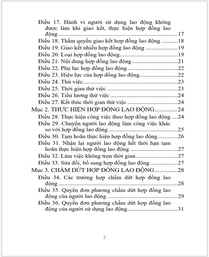 Chương 1: NHỮNG QUY ĐỊNH CHUNG Chương 2:  VIỆC LÀM TUYỂN DỤNG VÀ QUẢN LÝ LAO ĐỘNG Chương 3: HỢP ĐỒNG LAO ĐỘNG Chương 4: GIÁO DỤC NGHỀ NGHIỆP, PHÁT TRIỂN KỸ NĂNG NGHỀ Chương