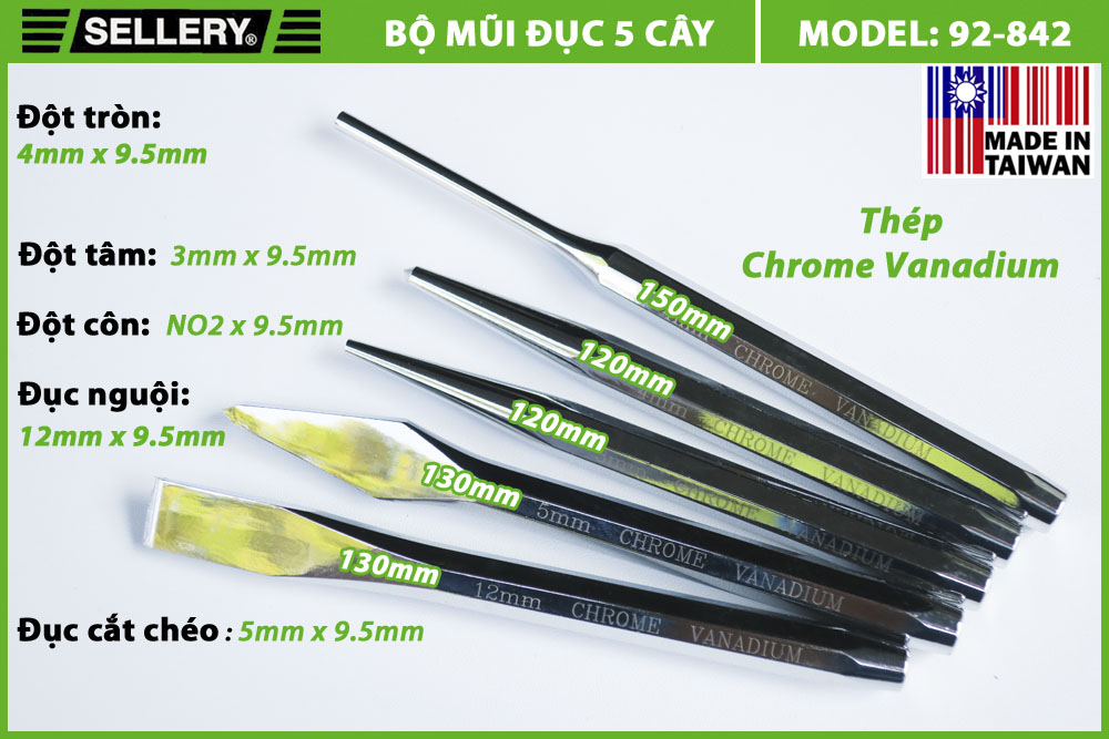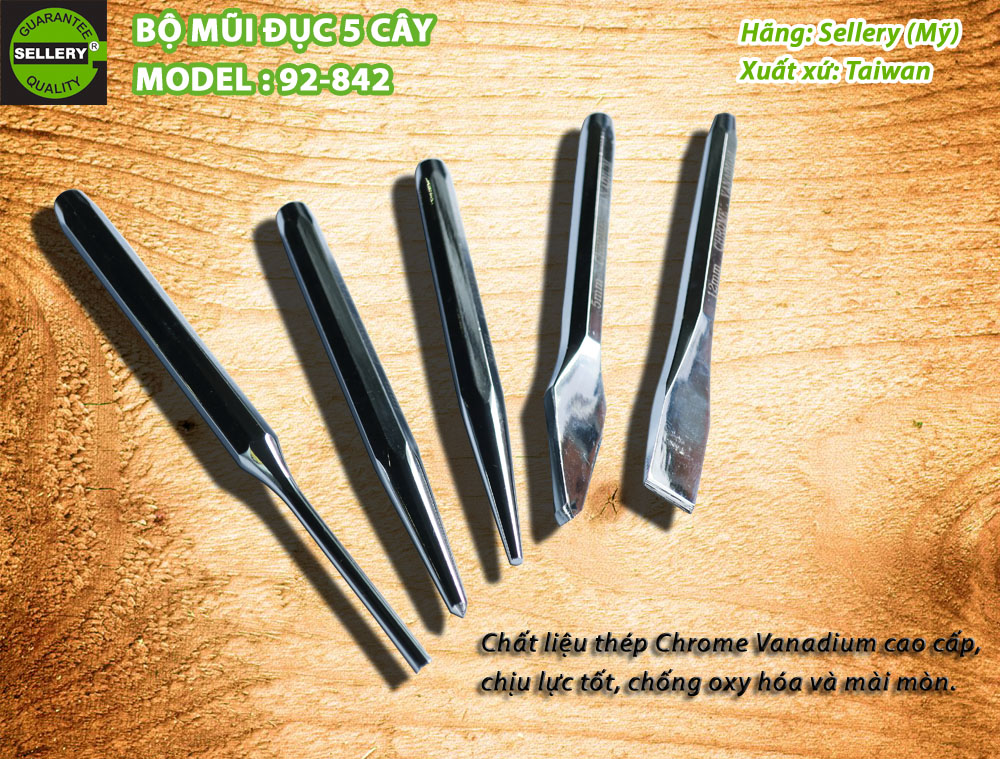 - Bộ mũi đục 5 cây Sellery 92-842 là bộ đục và đột sắt khá tiện ích khi bao gồm một mũi đục nguội, một đục cắt chéo, một mũi đột côn, một mũi đột tròn và một mũi đột lấy dấu được làm từ Thép Chrome Vanadium có độ cứng tối ưu, phù hợp gia công trên sắt của các bác thợ nguội.