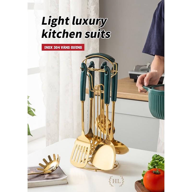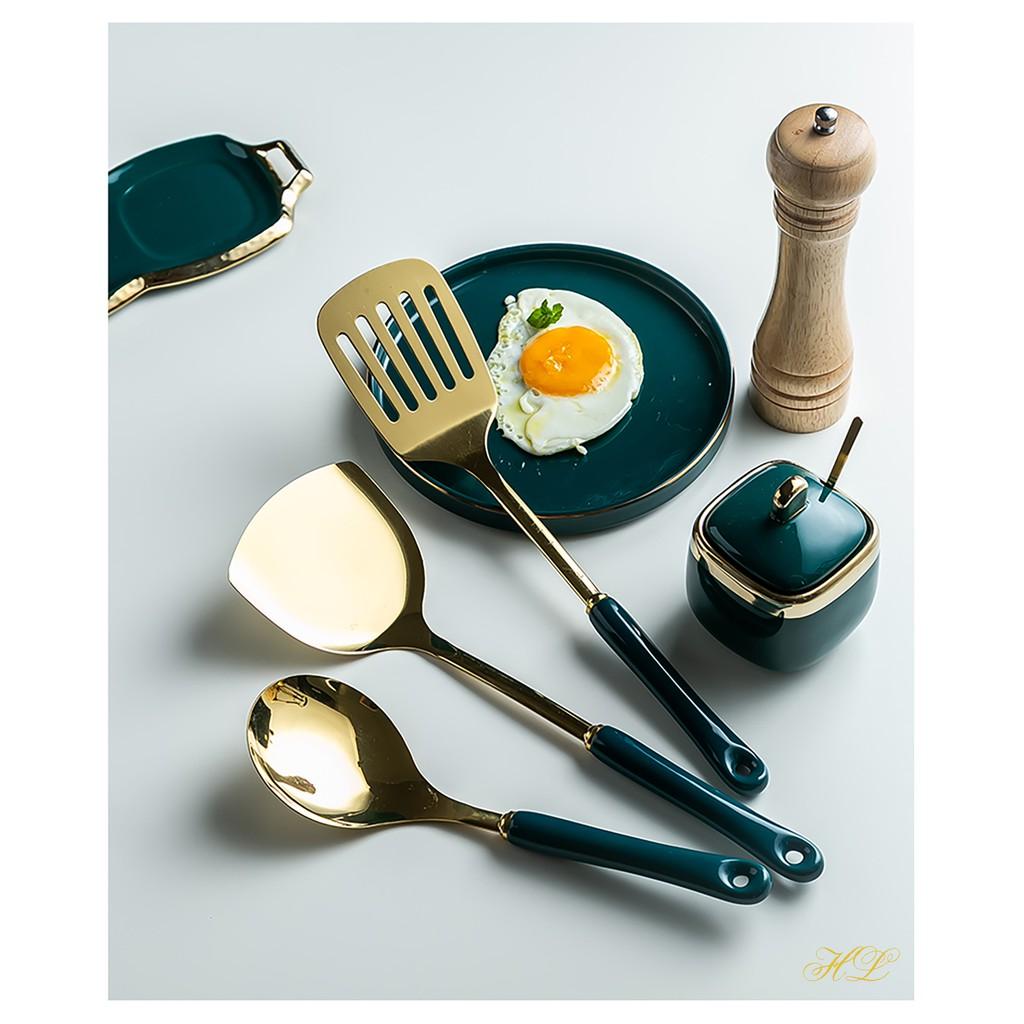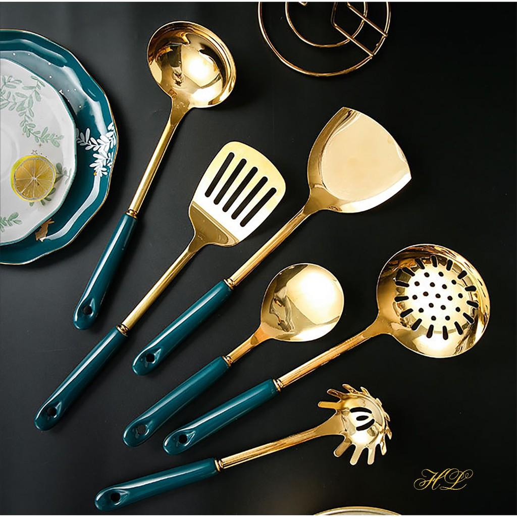 ✨BỘ MUÔI CANH XẺNG INOX VÀNG GƯƠNG CÁN SỨ KÈM GIÁ TREO | BỘ MUÔI VÁ VÀNG GƯƠNG CAO CẤP (LOẠI 1 BẢN SỨ CẦM DÀI)