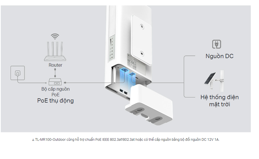 - Thiết lập đơn giản: Quản lý mạng dễ dàng qua ứng dụng Tether. Wi-Fi 4G Tốc Độ Cao Internet Ổn Định Ở Mọi Nơi Mở Rộng Wi-Fi Ở Mọi Nơi Trong Nhà Bạn Kết Nối Internet Wi-Fi 4G Ổn Định TL-MR100-Outdoor hỗ trợ 4G LTE với tốc độ tải xuống lên tới 150 Mbps, kết hợp với Wi-Fi nhanh đến 300 Mbps, mang đến trải nghiệm mạng liền mạch.* Chỉ cần lắp SIM để tận hưởng Internet ổn định trong nhà và ngoài trời. ◇ ◇ Thiết bị yêu cầu SIM đã kích hoạt và không có mã PIN. Nếu SIM bị khóa, vui lòng tham khảo hướng dẫn cài đặt nhanh để mở khóa. Thiết Kế Ngoài Trời Bền Bỉ Trong Mọi Thời Tiết Được thiết kế cho môi trường khắc nghiệt, TL-MR100-Outdoor có khả năng chống nước IP65, hoạt động trong dải nhiệt từ -30°C đến 60°C và bảo vệ chống sét 6kV & chống tĩnh điện 15kV. Duy trì kết nối không gián đoạn trong thời tiết xấu, mang lại hiệu suất mạng ngoài trời ổn định. Lắp Đặt linh Hoạt Cho Nhiều Môi Trường Khác Nhau TL-MR100-Outdoor hỗ trợ nhiều phương án lắp đặt — gắn lên cột, tường hoặc dán lên cửa sổ. Tính linh hoạt này phù hợp với nhiều môi trường, từ thành thị đến nông thôn. Dễ dàng tìm vị trí tối ưu để đảm bảo tín hiệu và kết nối ổn định. Hỗ Trợ Nguồn PoE/DC: Đơn Giản Hóa Lắp Đặt Ngoài Trời Dễ dàng thiết lập và quản lý Thiết lập TL-MR100-Outdoor chỉ trong vài phút nhờ giao diện web trực quan và ứng dụng Tether mạnh mẽ. Tether cũng cho phép bạn quản lý cài đặt mạng từ thiết bị Android hoặc iOS, bao gồm kiểm soát của phụ huynh và quyền truy cập.