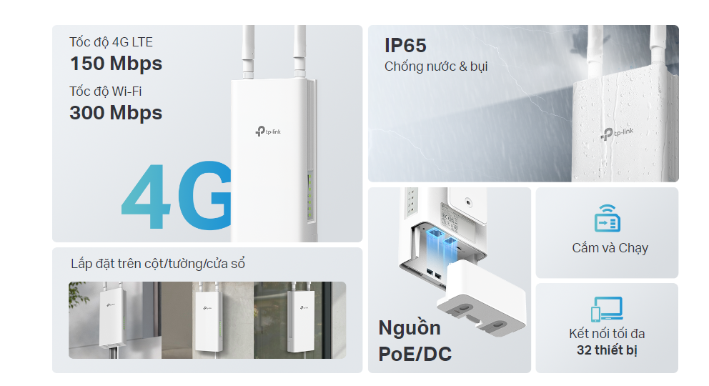 Bộ Phát Wi-Fi Ngoài Trời 4G Tốc Độ 300 Mbps - 4G LTE và Wi-Fi tốc độ cao: Hỗ trợ LTE lên đến 150 Mbps và Wi-Fi 2.4 GHz lên đến 300 Mbps.* - Thiết