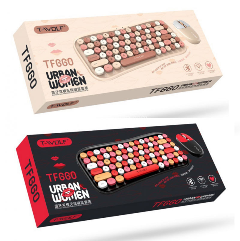 Bàn phím + chuột T-Wolf TF660 được thiết kế 84 phím bấm tròn trải đồng đều, màu sắc hài hòa với chuột không dây, hơn nữa trên bàn phím bấm với 3 gam màu trong rất
