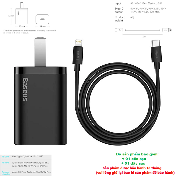Bộ sạc nhanh, nhỏ gọn Baseus Super Si Quick Charger 20W dùng cho iPhone 12