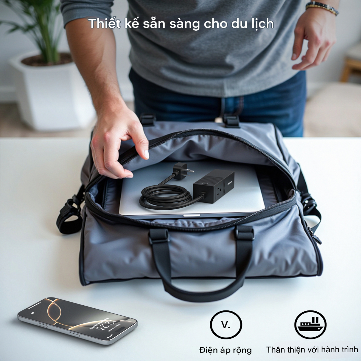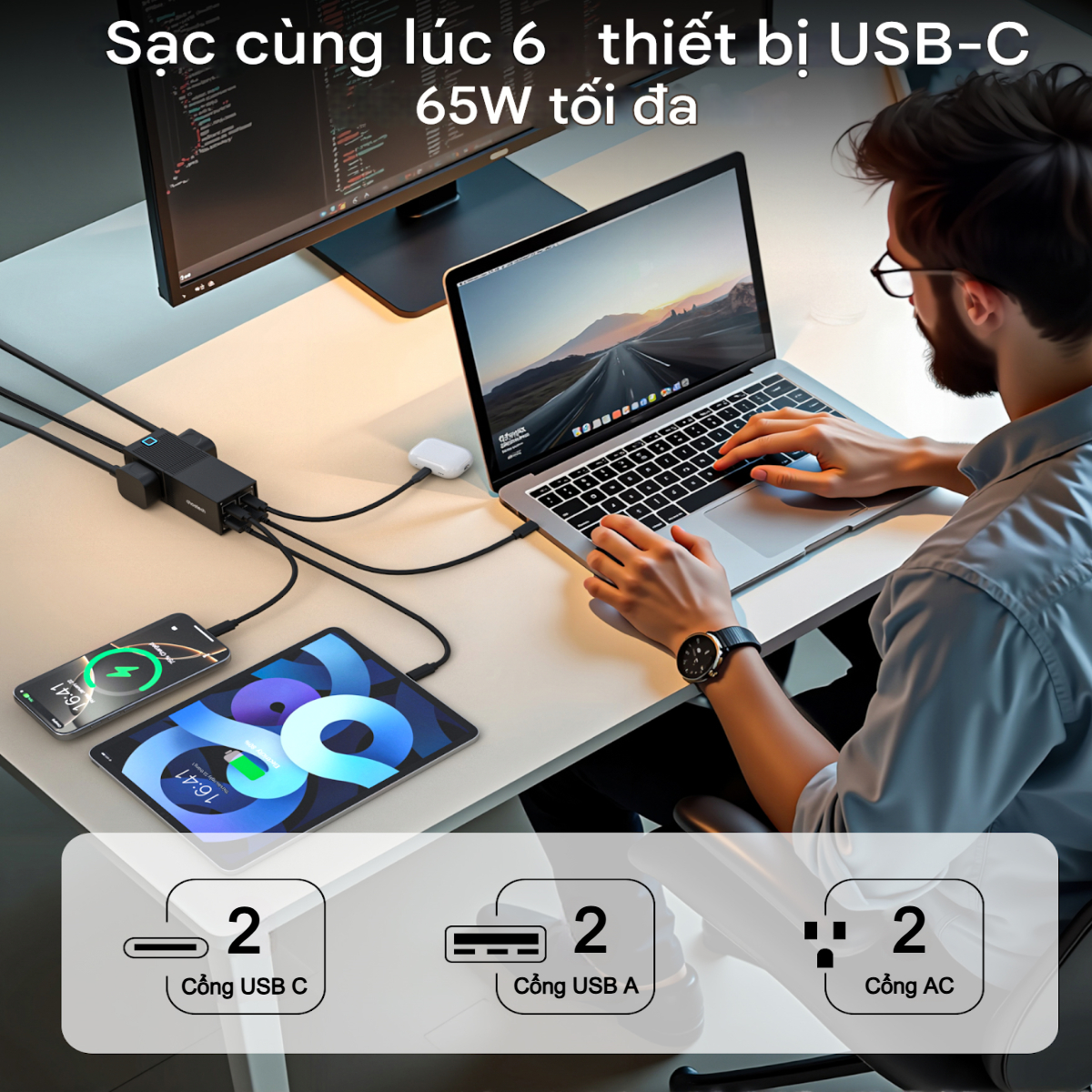 - Màu sắc: Đen Thông tin chi tiết Công nghệ GaN Pro – Nhỏ gọn hơn, mát hơn, mạnh mẽ hơn – Ứng dụng vật liệu bán dẫn GaN thế hệ mới giúp tối ưu kích thước, tăng hiệu suất truyền tải năng lượng và giảm nhiệt khi sạc – an toàn hơn, bền bỉ hơn. Sạc nhanh toàn diện 65W – 2 cổng USB-C PD: Hỗ trợ sạc nhanh cho Mac-Book, i-Pad, iP, điện thoại Android, tablet… – 2 cổng USB-A: Tương thích với mọi thiết bị khác như tai nghe, camera, smartwatch… – Tổng công suất lên đến 65W, phân phối thông minh giữa các cổng khi sử dụng cùng lúc. Dây nối AC tiện lợi & ổ cắm mở rộng – Trang bị dây nguồn bọc dù cao cấp dài 1.5m giúp linh hoạt bố trí ở bất kỳ không gian nào. – Tích hợp 1 ổ cắm mở rộng – cắm thêm laptop, đèn bàn, quạt mini… cực kỳ tiện dụng. Nút nguồn sang trọng – Nút bấm cảm ứng nhạy, tích hợp đèn LED hiển thị trạng thái hoạt động rõ ràng, hiện đại. – Chỉ cần 1 chạm để bật/tắt toàn bộ hệ thống – an toàn & tiết kiệm điện. Thiết kế tối giản, bền bỉ – Kiểu dáng khối vuông chắc chắn, phủ lớp nhám chống trượt và chống bám bẩn. – Vật liệu chống cháy ABS + PC bền bỉ, an toàn cho người dùng và thiết bị điện tử. Hình ảnh Bộ sạc nhanh GaN Pro 65W (2 Type C+ 2 USB-A) Choetech PD8054 kèm dây AC nối dài 1.5m - Hàng chính hãng