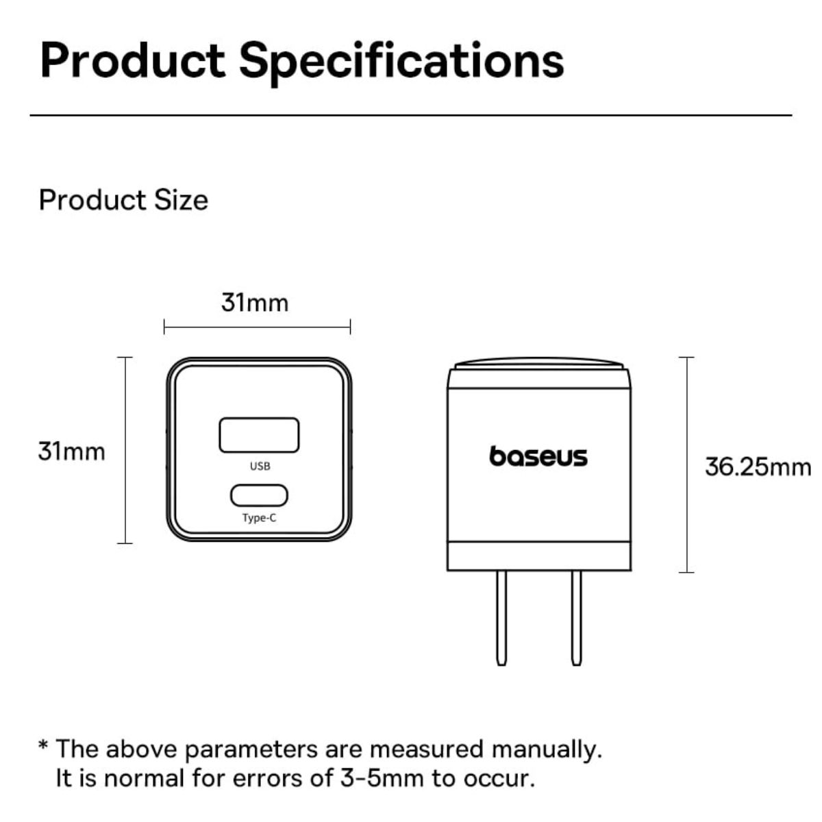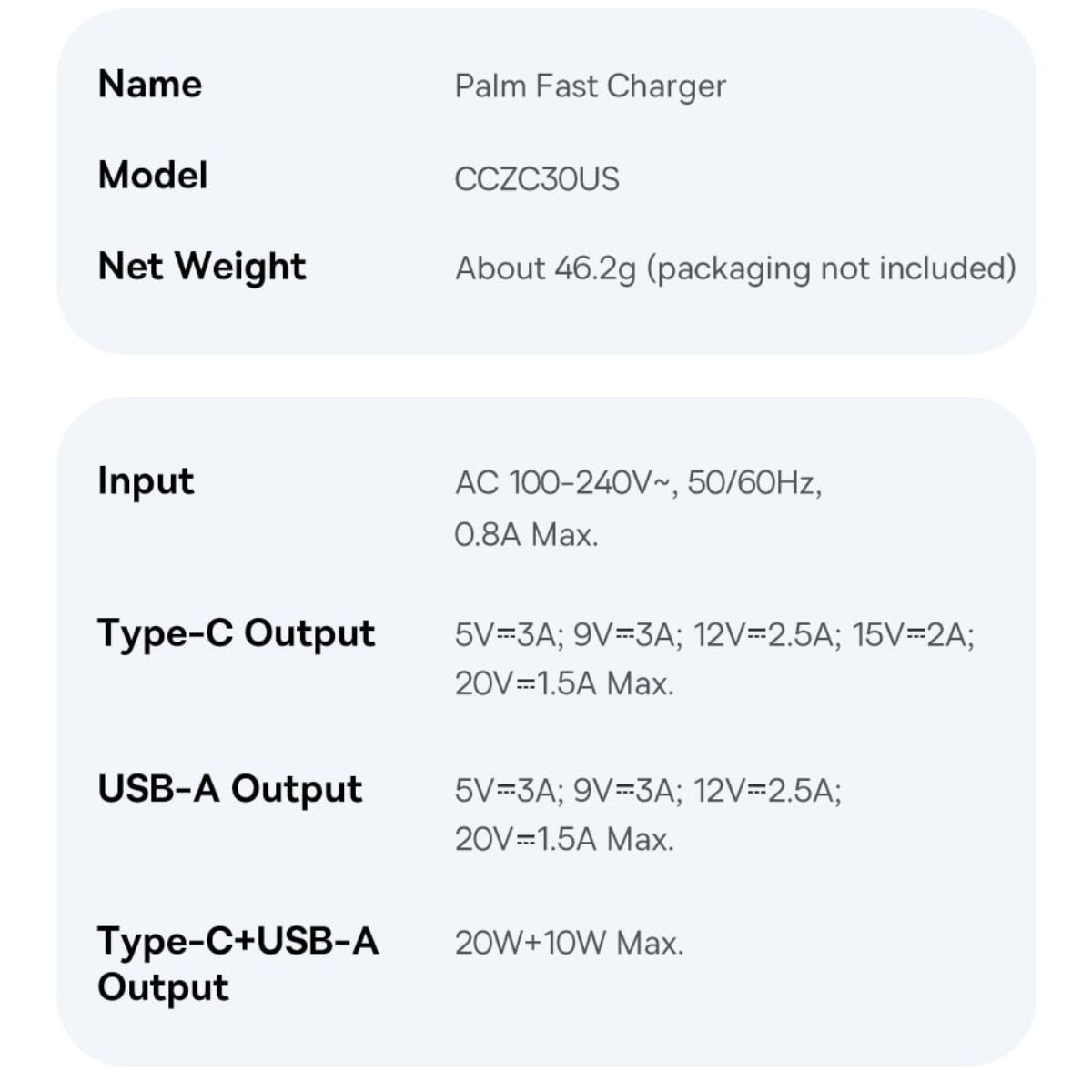 1. Input: 100-240V~50/60Hz 700mA Max 2. Output: 5V/3A 9V/2.77A 12V/2.08A 3. PPS: 3.3~11V/2.25A 4. Total Output Power: 25W Max 5. Compatible with: 6. PD3.0 (PD2.0) 7. QC4.0+ (QC4.0/QC3.0/QC2.0) 8. FCP/AFC/PPS 9. BC1.2--5V1.5A 10. UL, PSE,