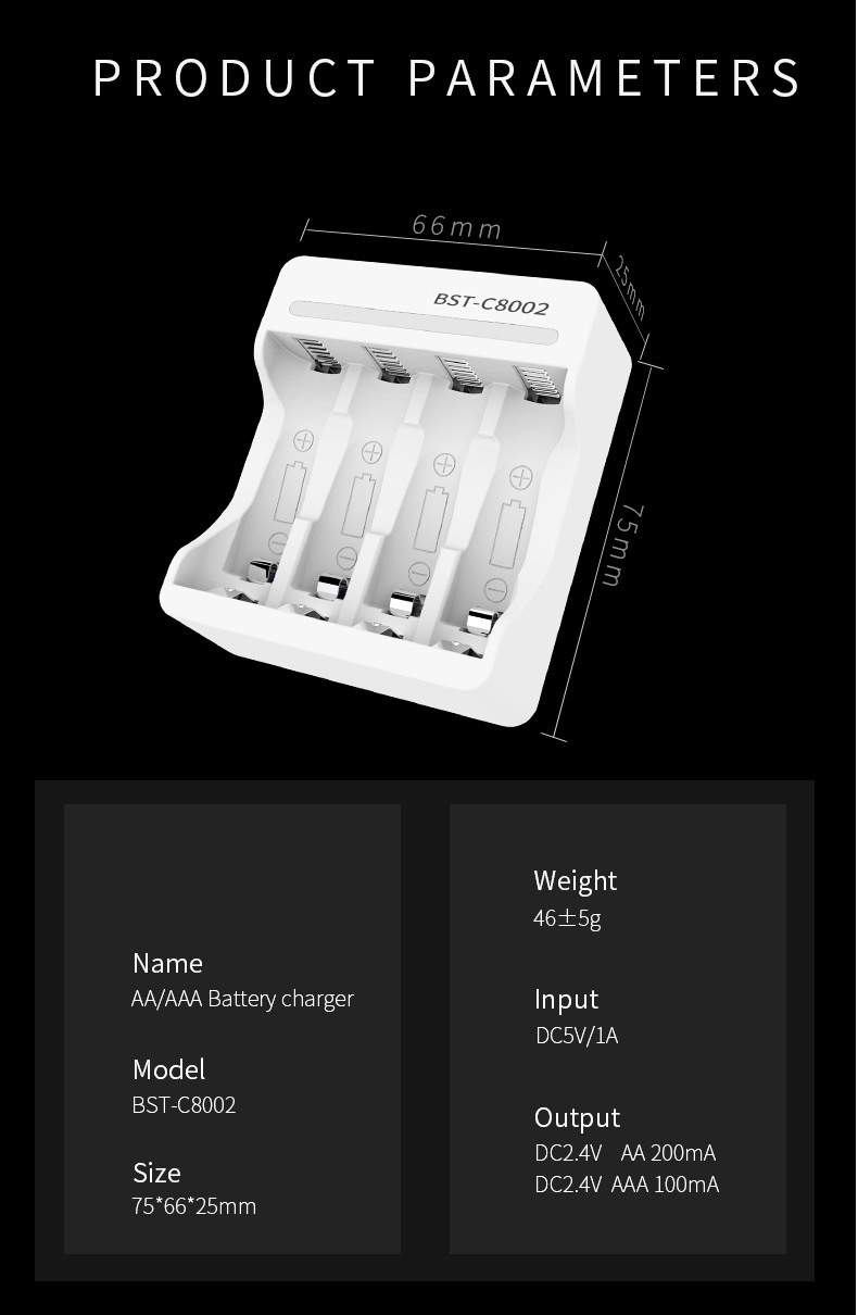 Sạc BST-C8002 : – Dùng được cho các cỡ Pin : AA, AAA. – Dùng cho Pin có thể sạc được; Điện áp 1.2V Ni-Mh/Ni-Cd. – Sạc được đến 4 pin các loại. – Dòng