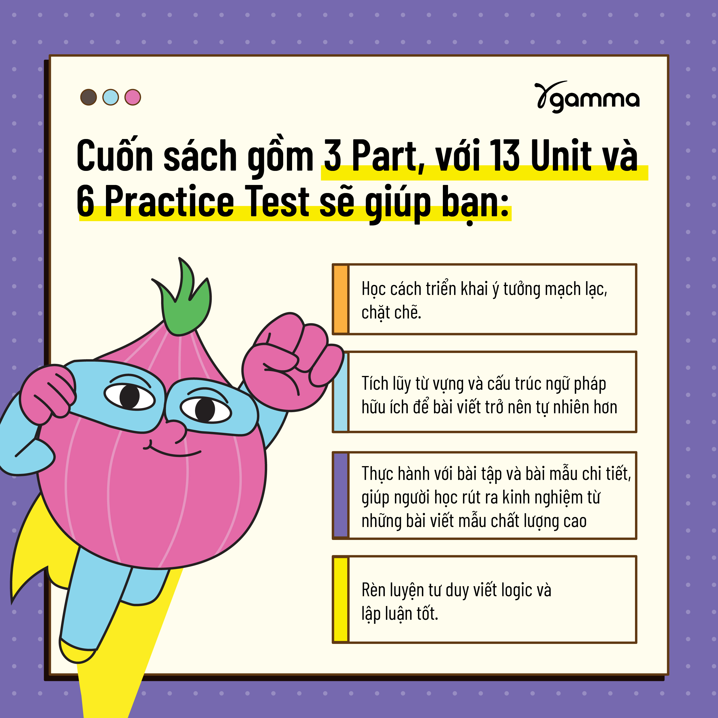 Nếu bạn từng cảm thấy bối rối khi đối diện với một đề bài viết IELTS, không biết bắt đầu từ đâu hay làm thế nào để triển khai ý tưởng một cách rõ ràng, hãy để IELTS Writing Starters band 4.0 – 6.0 tháo gỡ những khó khăn đó. Cuốn sách gồm 3 Part, với 13 Unit và 6 Practice Test này sẽ giúp bạn: