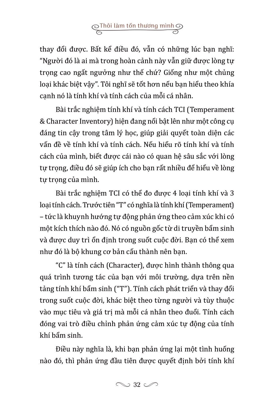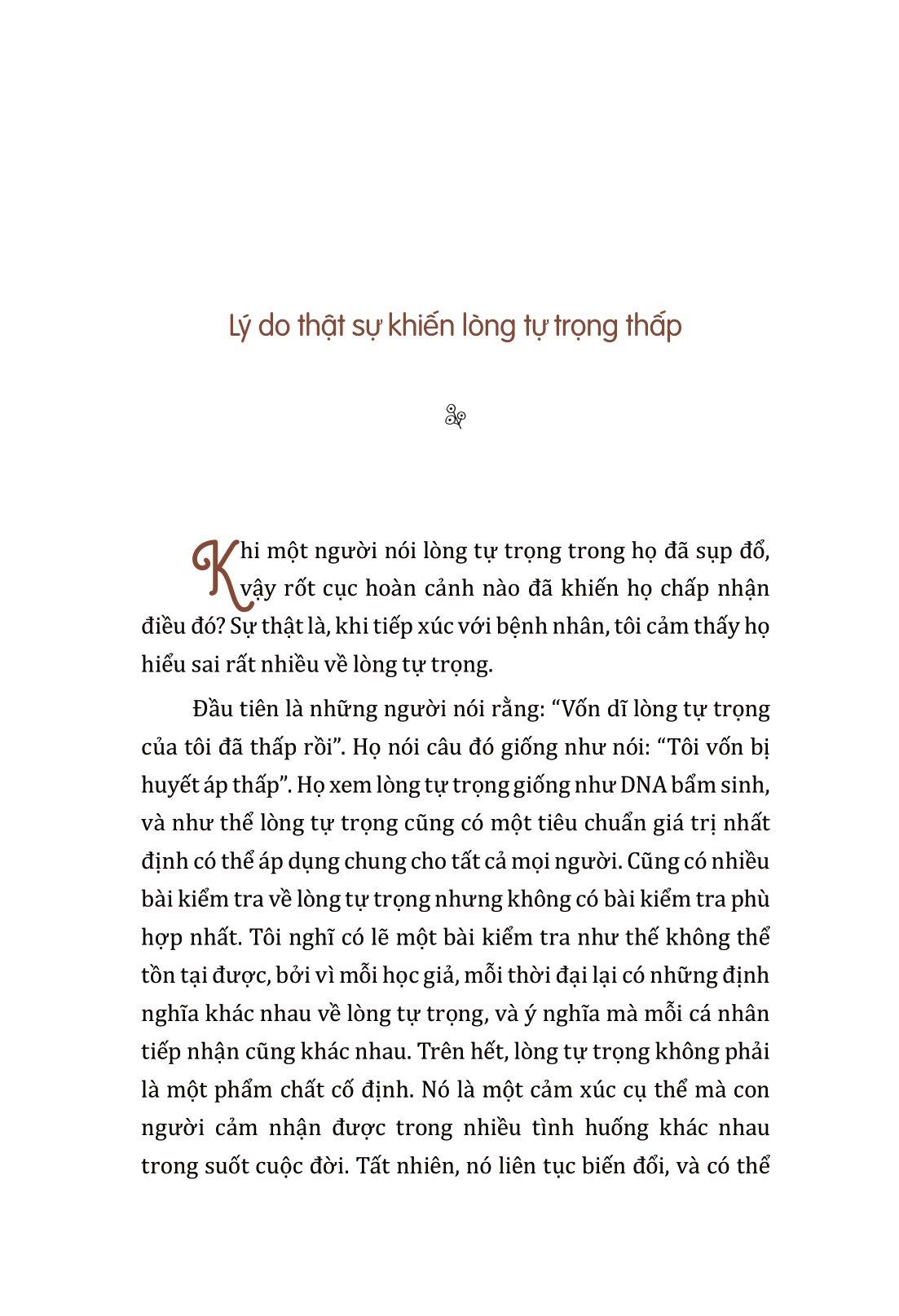 - Biểu hiện của những người có lòng tự trọng thấp. Mong rằng những bạn trẻ đang mang trong m.ình những vết thương do lòng tự trọng giả tạo gây ra, sau khi đọc quyển sách “Thôi Làm Tổn Thương Mình” này, sẽ có thể tự m.ình đứng dậy, có được lòng tự trọng thật sự và có thể đồng cảm với người khác.