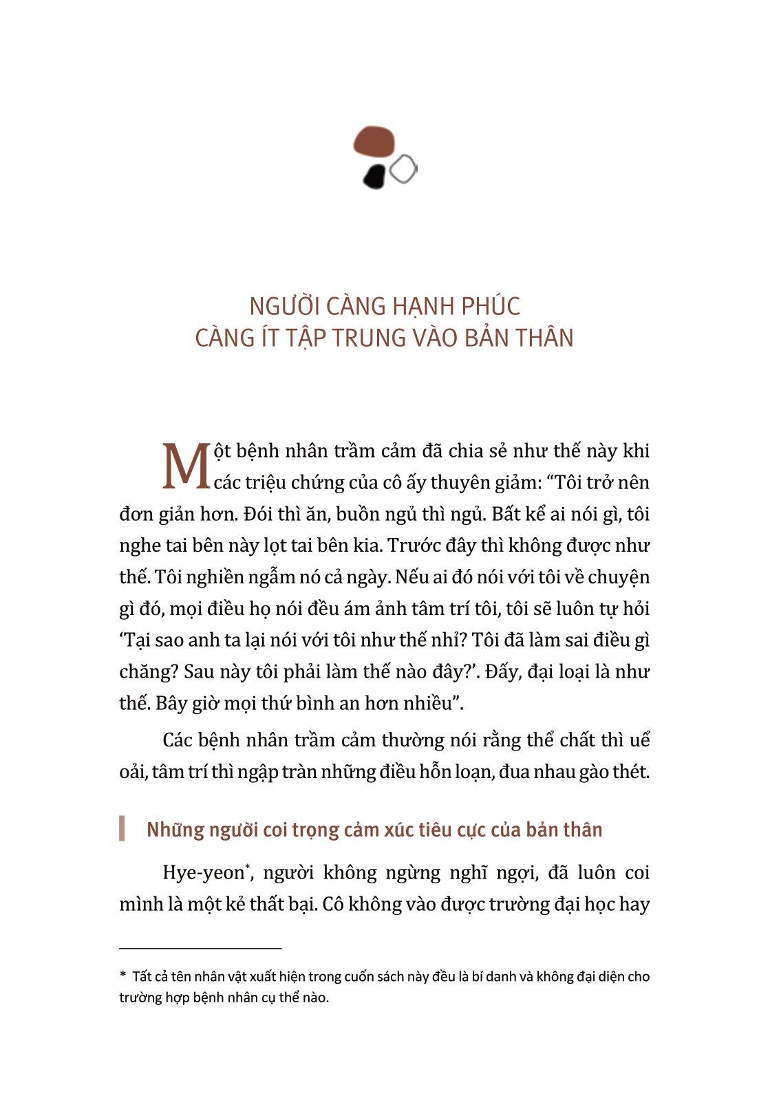 - Thôi Làm Tổn Thương Mình Lòng tự trọng giả tạo Lòng tự trọng đã trở thành chủ đề của thời đại ngày nay. Đây có thể là chuyện tốt, bởi vì nó chứng tỏ có rất nhiều người đang mong muốn tìm lại “cái tôi” của m.ình. Đi tìm chính m.ình là một nhu cầu thuộc về bản năng của con người. Đó là một mục tiêu đẹp đẽ và xứng đáng để chúng ta theo đuổi trong đời. Và như vậy, điều quan trọng là cần phải nhận ra điều gì làm nên “cái tôi” thật sự. Bạn không nên dễ dàng bỏ cuộc khi theo đuổi “cái tôi chân chính” chỉ vì hiện thực quá khó khăn, vất vả. Bạn cũng không được say mê “cái tôi giả tạo” để không trở nên tầm thường trong mắt người khác. Nhưng vì lòng tự trọng mà ai cũng tự thấy m.ình tầm thường, đến mức câu nói “Đố kị tức là thua” đã trở nên phổ biến. Và sẽ mệt mỏi hơn nữa nếu bạn để m.ình tụt lại phía sau trong một cuộc cạnh tranh hoặc khi bạn rơi vào cảm giác bất lực không lối thoát. Lòng tự trọng giả tạo phổ biến trong xã hội Hàn Quốc là do thể chế chủ nghĩa tân tự do chỉ chăm chăm tăng cường sức cạnh tranh và thúc đẩy năng suất. Thôi Làm Tổn Thương Mình - Cuốn sách dành cho những ai đang có nhiều vết thương lòng Thông qua việc phân biệt lòng tự trọng thật sự và lòng tự trọng giả tạo, tác giả Jun Mee Kyung – là một giảng viên y khoa chuyên về sức khỏe tâm thần đã viết nên cuốn sách “Thôi Làm Tổn Thương Mình”. Cuốn sách này là câu chuyện kể về tất cả chúng ta, những người đang sống mà quên mất hạnh phúc là gì. Những bạn trẻ đang mang trong m.ình nỗi thất vọng, những vết thương và đang dần mất đi lòng tự trọng, hãy một lần đọc nó vì quyển sách này sẽ giúp nâng cao sự hiểu biết về lòng tự trọng thật sự, từ đó cấu trúc xã hội cũng như hệ thống giáo dục cũng sẽ được cải thiện theo cách tương xứng Tác giả mong muốn mỗi chung ta tự tin hơn về bản thân, biết rõ bản thân là ai, không so sánh bản thân với người khác, không khao khát sự công nhận và sống cuộc đời hạnh phúc hơn. Một số nội dung được đề cập trong sách I Don’t Hurt Myself:
