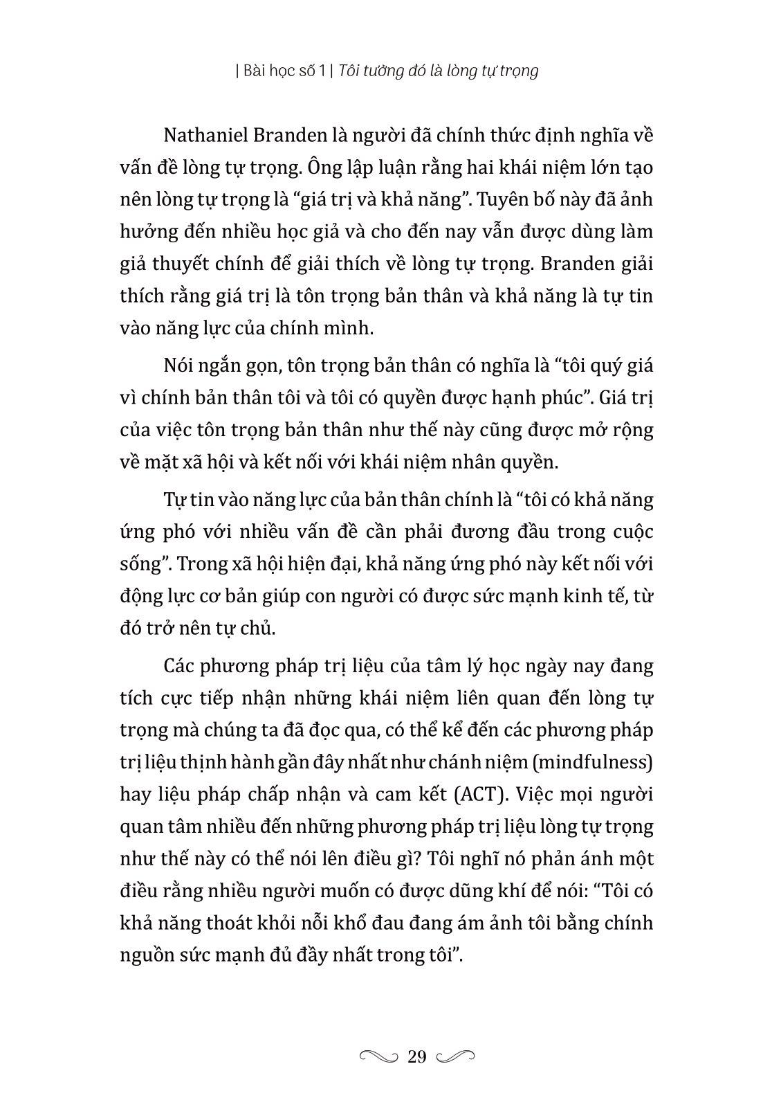 - Năm bước xây dựng lòng tự trọng (có trải nghiệm tích cực, học hỏi từ những mentor tốt, tích lũy thông tin/kiến thức hợp lý và đúng, nâng cao trực giác, nuôi dưỡng năng lực hành động)