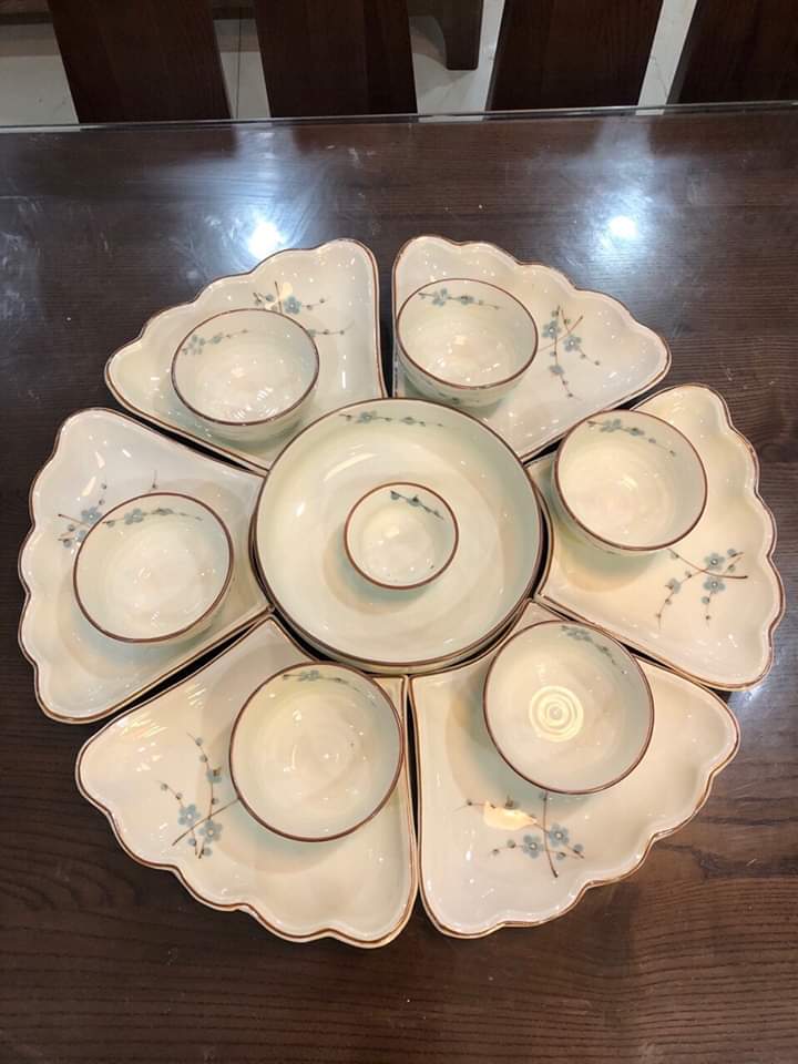 Bộ đồ ăn men lam vẽ hoa đào Gốm sứ Bát Tràng cao cấp không chì Bộ đồ ăn gồm 15 món như hình 6 bát cơm 1 bát mắm 1 đĩa muối 1 đĩa