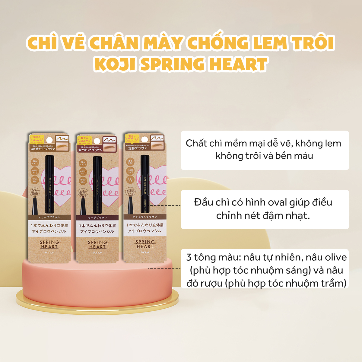 - Chì vẽ chân mày kháng nước chống lem trôi Koji Spring Heart Eyebrown Pencil - Có 3 màu : Nâu tự nhiên - Nâu Đỏ Trầm (phù hợp tóc nhuộm màu tối) - Nâu Olive (phù hợp tóc nhuộm màu sáng)