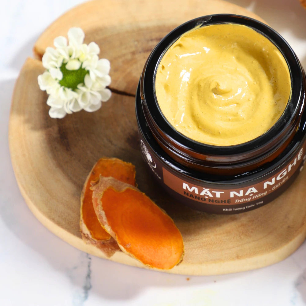 - Mặt nạ nghệ hữu cơ làm từ nano nghệ, cám gạo, glycerin, trà xanh, việt quất, hạt việt quất xay,...