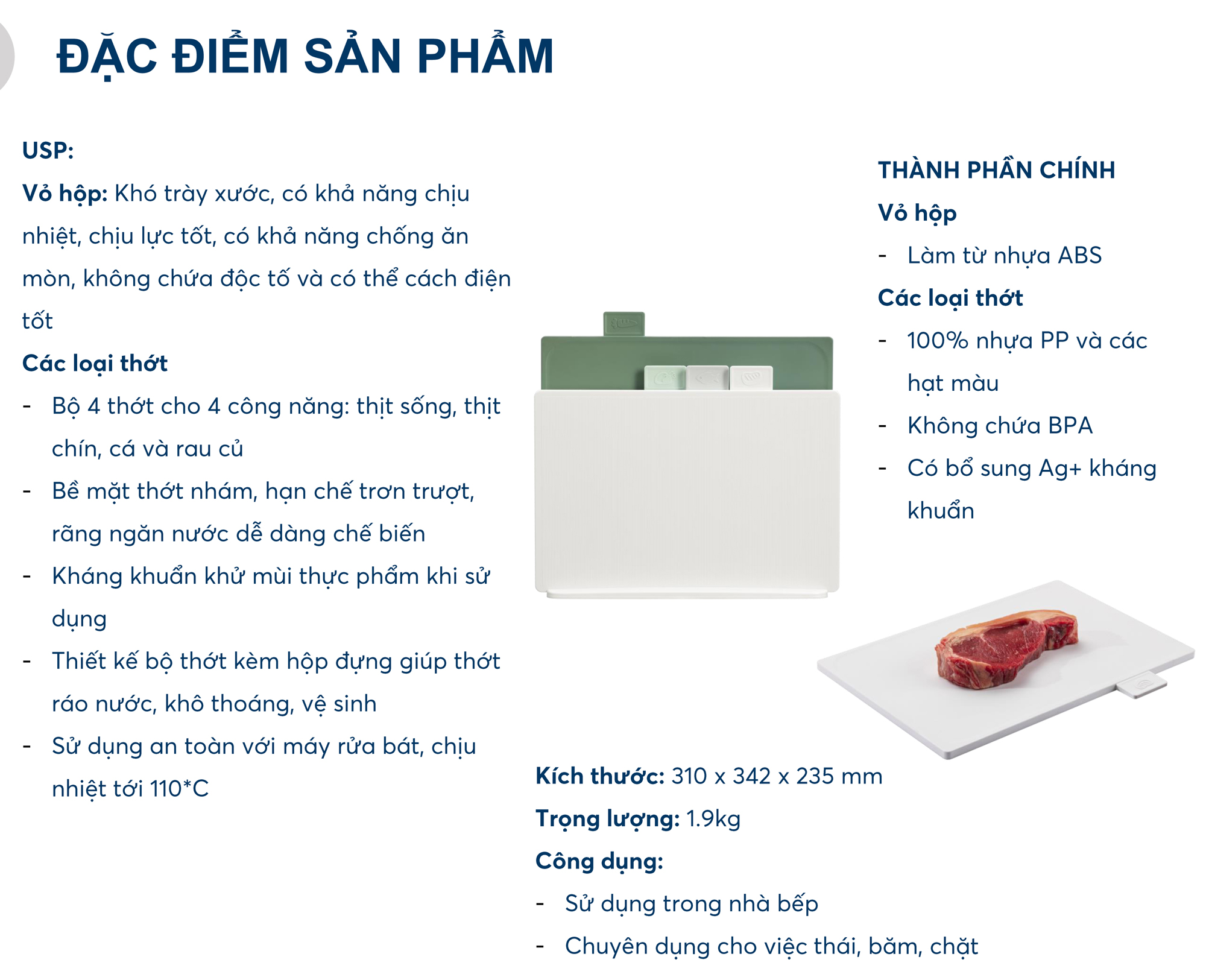 *THÔNG SỐ KỸ THUẬT : - Hộp đựng thớt : + Kích thước : 35.5x26.5x7.4cm + Chất liệu : ABS - 4 thớt phân loại màu + Kích thước : 34x24x0.8cm + Chất liệu :