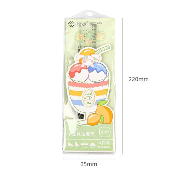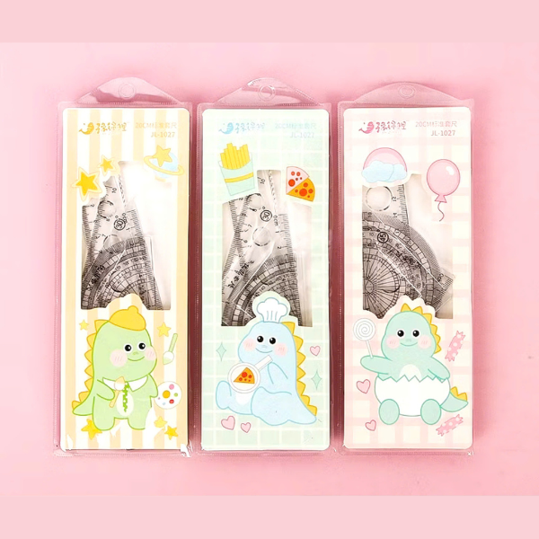 Kích thước bao bì: 8.5 x 22cm Bộ sản phẩm bao gồm: 1. Thước thẳng 20cm 2. Thước đo độ 1800 3. Thước đo góc tam giác 4. Thước đo góc tam giác bên phải