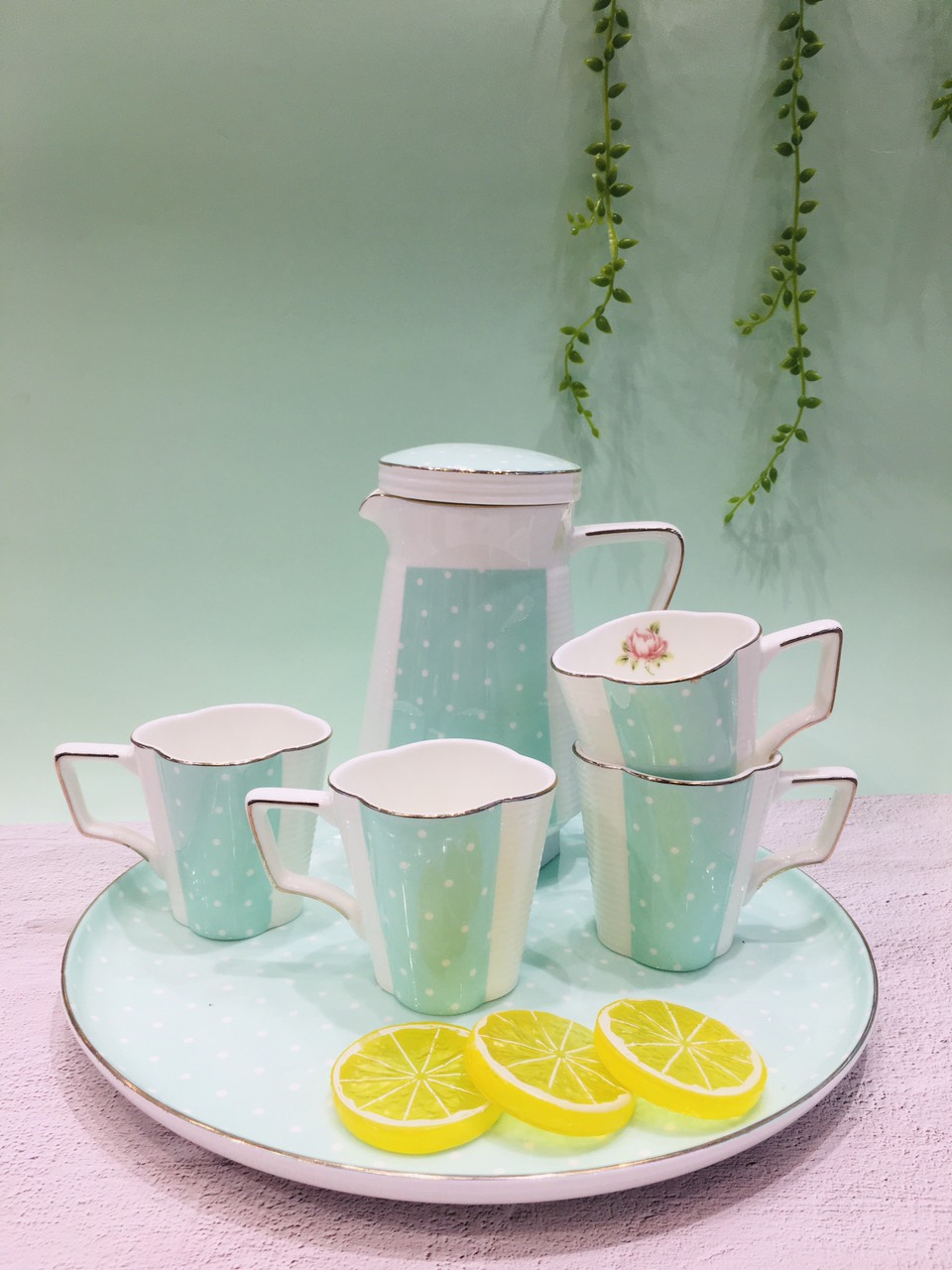 ✨Bộ trà sứ xương cao cấp cốc cao chấm bi xanh ROYAL 5546