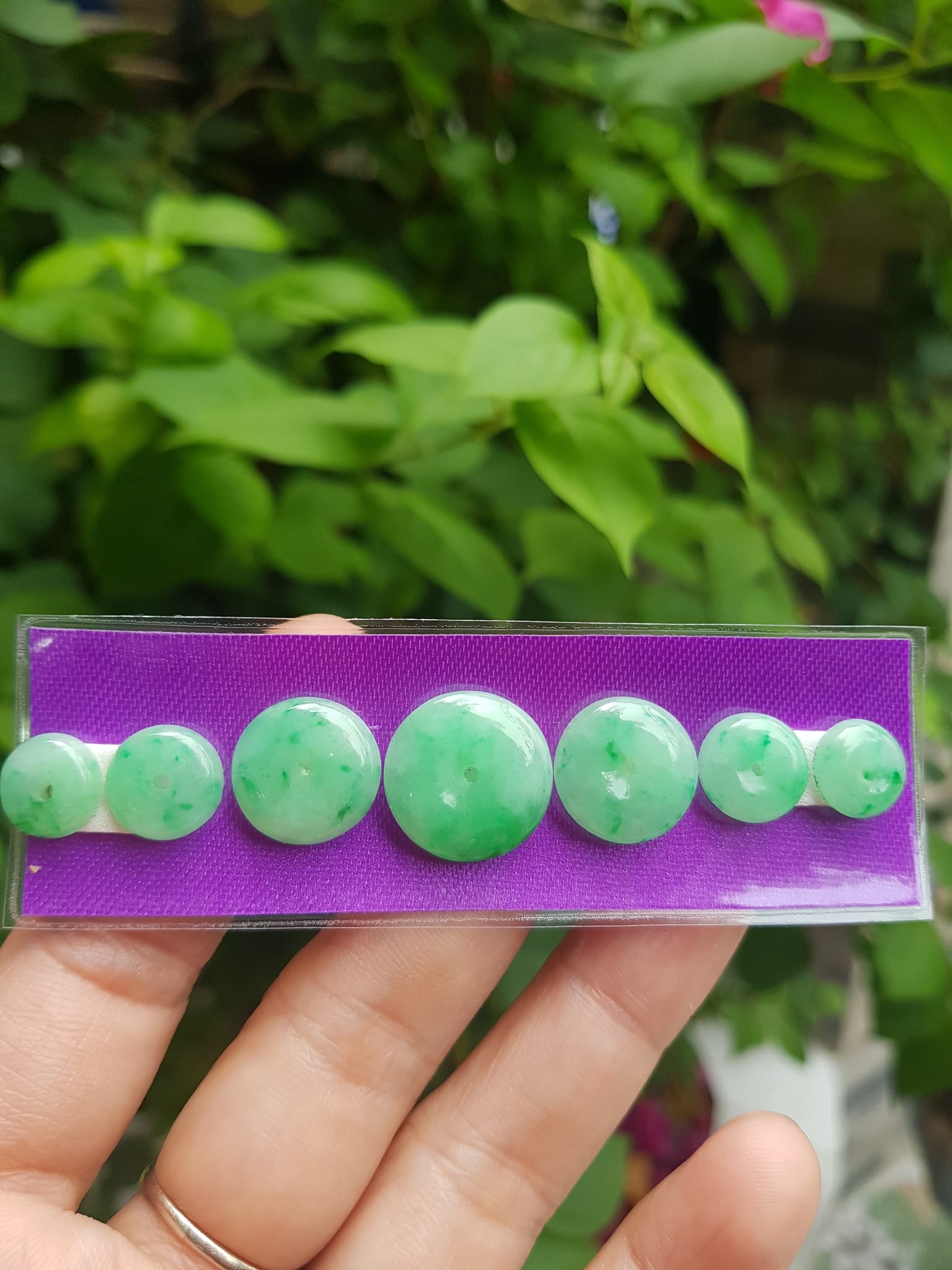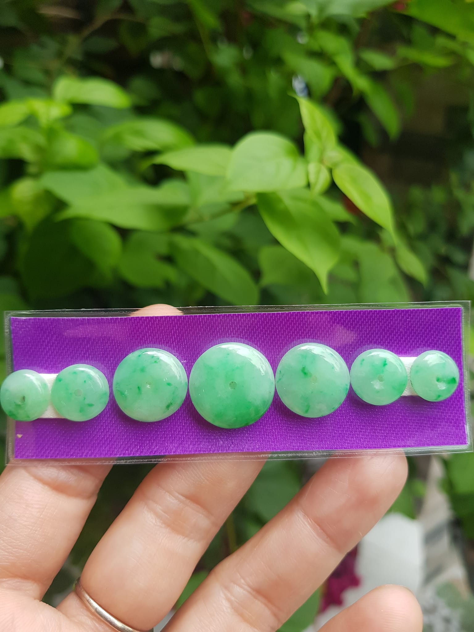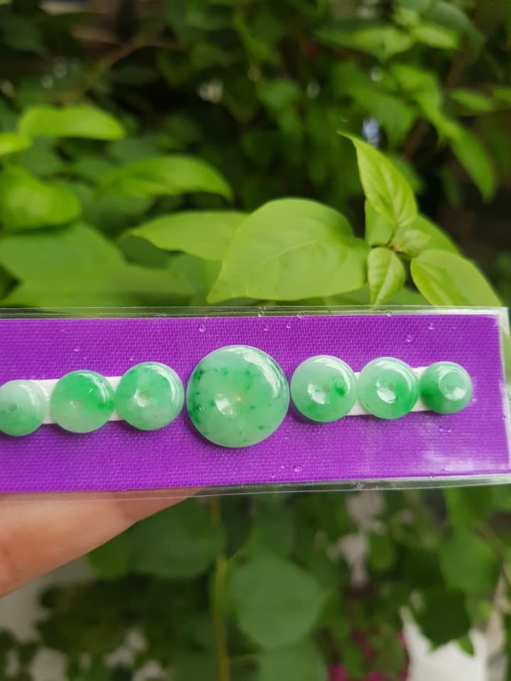 Bộ 5 đồng tiền đá cẩm thạch tự nhiên xanh ngọc đậm đều đẹp Nữ Phối vòng tay,mặt dây chuyền vàng đeo cực kỳ xinh xắn ạ Size hạt 9mm x dầy 3,8mm x lỗ