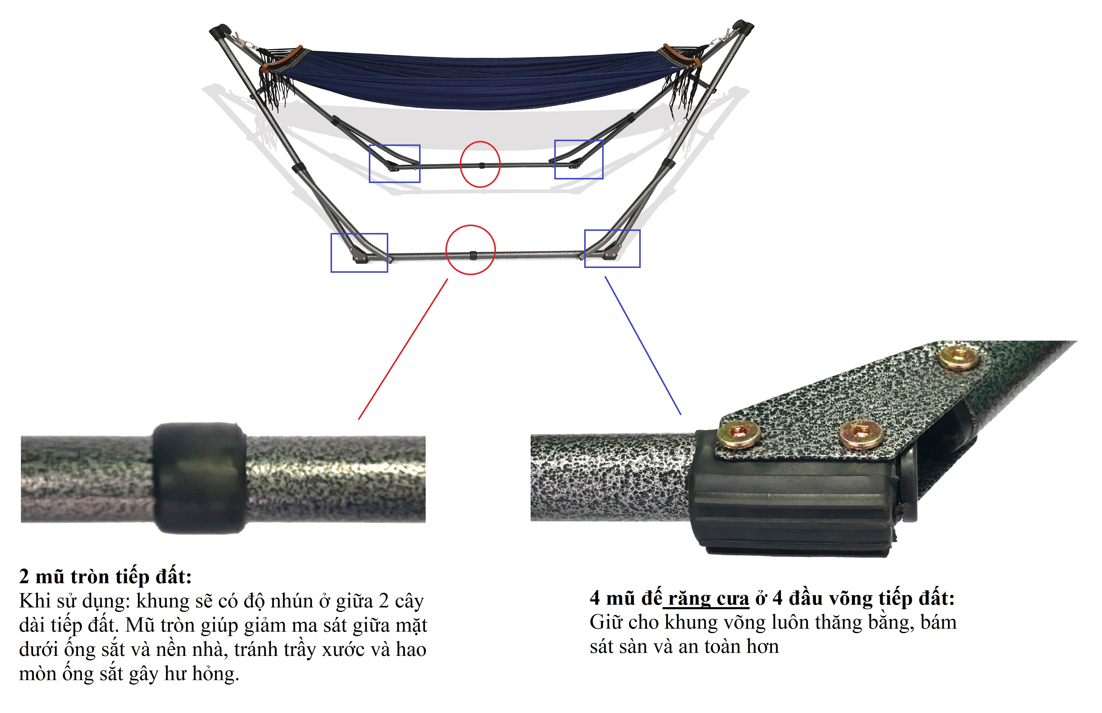 Ống thép, sơn tĩnh điện. đường kính 27.0mm, chiều dày 0.9mm. 4 thanh chống uốn cong, thẩm mỹ, thông thoáng, an toàn. Võng lưới sợi 100% polyester, mềm mịn, có độ co giãn, lưới Xuất