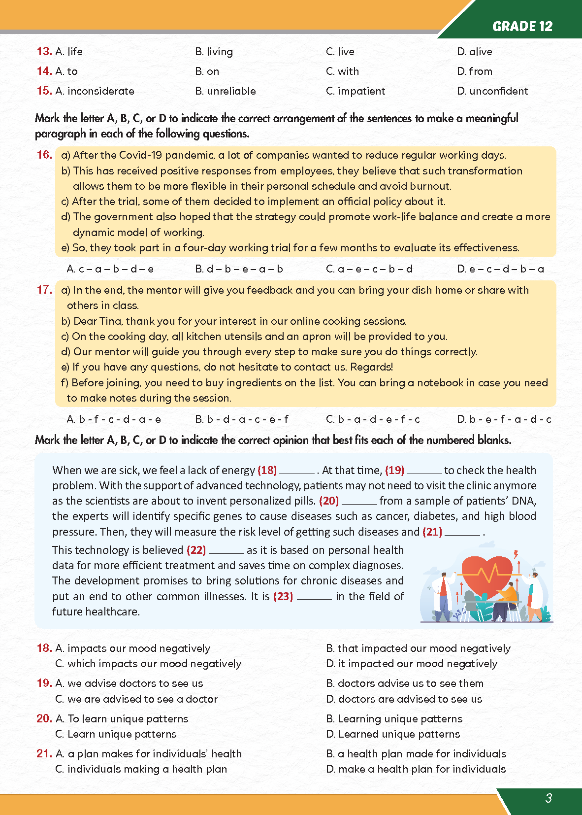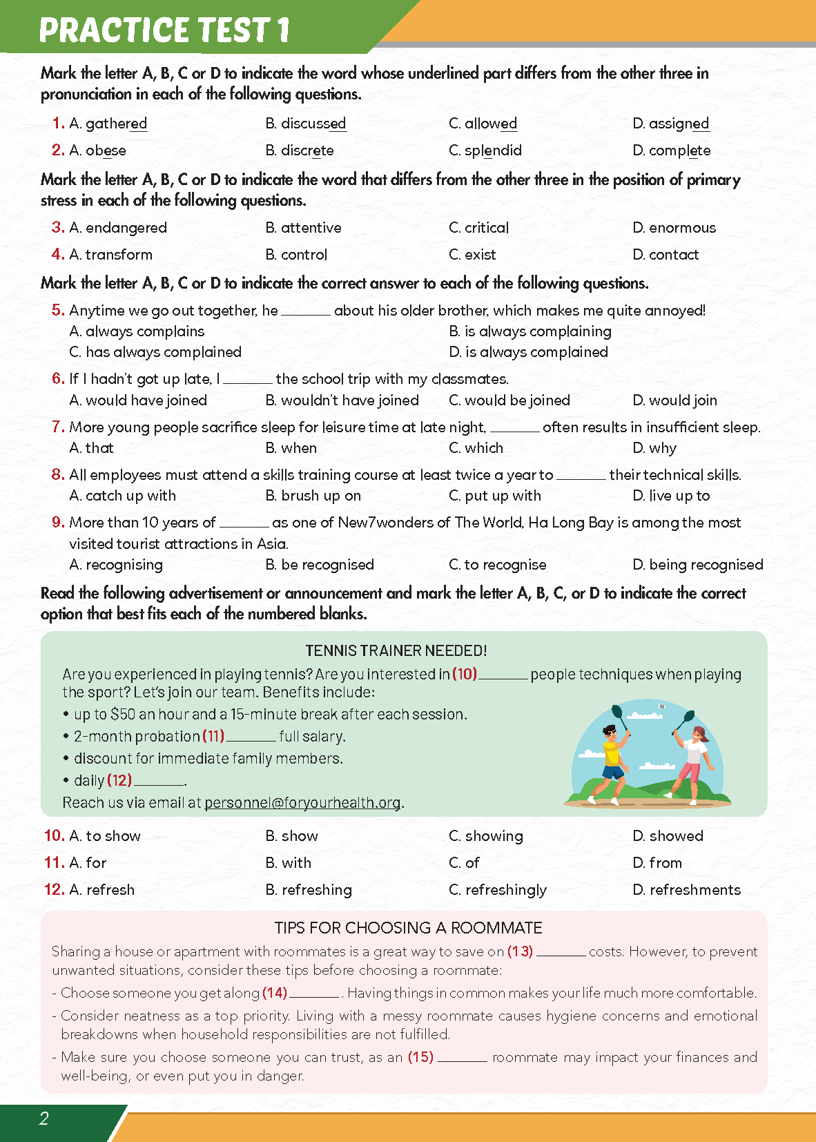 Practice Tests Grade 10 - 11 - 12 được biên soạn nhằm giúp học sinh củng cố kiến thức tiếng Anh lớp 10 và trang bị cho các em nguồn tài liệu luyện tập chuẩn
