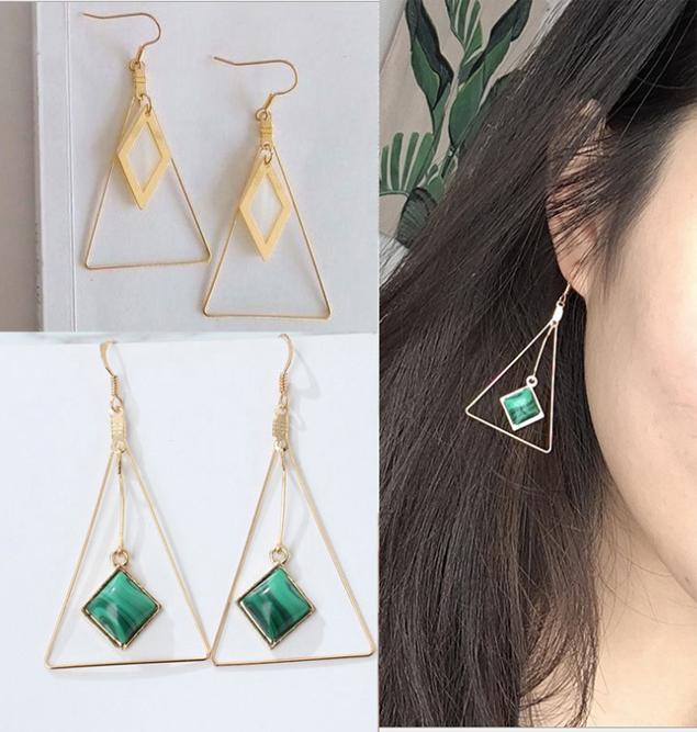 ✨Bông tai tam giác dáng dài đính đá xanh BT104