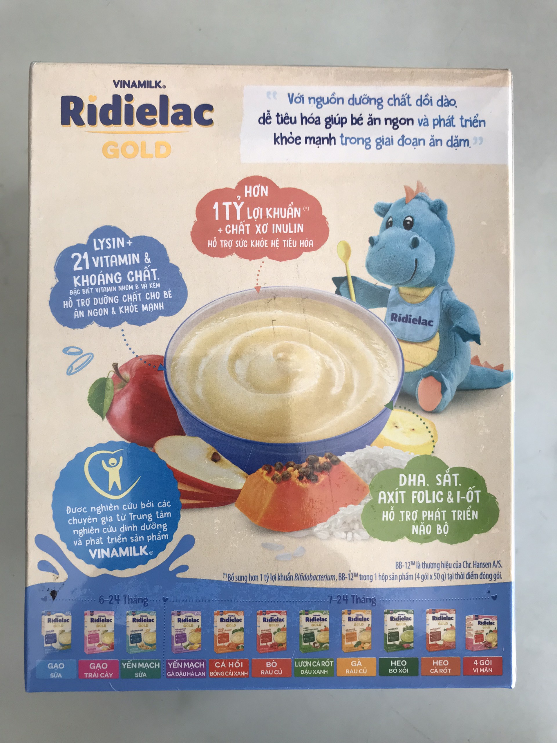 - Sản phẩm này là thức ăn bổ sung và được ăn thêm cùng với sữa mẹ dùng cho trẻ trên 06 tháng tuổi Bột ăn dặm RiDielac Gold dễ tiêu hóa được nghiên cứu bởi các chuyên gia từ Trung tâm nghiên cứu dinh dưỡng và phát triển sản phẩm VINAMILK, đáp ứng nhu cầu dinh dưỡng cho trẻ từ 6 đến 24 tháng tuổi, giúp bổ sung các dưỡng chất, hỗ trợ bé phát triển thể chất trong thời gian ăn dặm. HỖ TRỢ SỨC KHỎE HỆ TIÊU HÓA Bổ sung lợi khuẩn Bifidobacterium, BB-12TM cùng chất xơ hòa tan inulin giúp tăng vi khuẩn có lợi, ức chế vi khuẩn có hại, hỗ trợ tốt sức khỏe hệ tiêu hóa, giúp bé hấp thu nguồn dưỡng chất dồi dào, cho bé phát triển thể chất khỏe mạnh. BB-12 là thương hiệu của Chr. Hansen A/S. HỖ TRỢ DƯỠNG CHẤT CHO BÉ ĂN NGON VÀ KHỎE MẠNH Lysin, vitamin nhóm B và Kẽm giúp bé ăn ngon miệng. Ngoài ra, sản phẩm có chứa 21 vitamin và khoáng chất bao gồm Sắt, Canxi, vitamin D3, C, A, E,... giúp bé phát triển cứng cáp hơn. HỖ TRỢ PHÁT TRIỂN NÃO BỘ Axít folic, I ốt, Sắt, Taurin, Axít linoleic, đặc biệt DHA kết hợp với Lutein tạo thành hệ dưỡng chất thiết yếu cho sự phát triển của não bộ, võng mạc mắt, tăng khả năng nhận thức, ghi nhớ và học hỏi của bé. THÔNG SỐ SẢN PHẨM <td style="box-sizing: border-box; padding: 8px; margin: 0px; border: 1px solid #dddddd; font-style: inherit; font-variant: inherit; font-weight: inherit; font-stretch: inherit; font-size: inherit; line-height: 1.42857; font-family: inherit; vertical-align: top; width: 224px Gạo Trái Cây Gạo Sữa Yến mạch sữa Thành phần trung bình Đơn vị Mỗi bữa ăn 50g Năng lượng kcal 209 209 211 Chất đạm g 7,5 7,5 7,5 Chất béo g 4,5 4,5 5,4 Axit Linoelic mg 2200 2200 2100 DHA (Docosahexaenoic acid) mg 10 10 12,5 MCT (Medium Chain Triglycerides) g 0,5 Hydrat cacbon g 34,3 34,3 32,9 Chất xơ hòa tan g 1 1 Chất xơ thực phẩm g 1,3 Lysin mg 500 500 500 Taurin mg 20 20 20 Lutein mcg 17,5 17,5 17,5 Khoáng chất Natri mg 75 75 75 Kali mg 275 275 275 Canxi mg 235 235 250 Phospho mg 175 175 200 Magnesi mg 17,5 17,5 17,5 Sắt mg 3,9 3,9 3,9 Iod mcg 40 40 40 Kẽm mg 1,6 1,6 1,6 Vitamin Vitamin A I.U 800 800 800 Vitamin D3 I.U 130 130 130 Vitamin E mg 2,1 2,1 2,1 Vitamin K1 mcg 10 10 10 Vitamin C mg 26 26 26 Vitamin B1 mcg 410 410 410 Vitamin B2 mcg 350 350 350 Vitamin PP mg 3,4 3,4 3,4 Vitamin B6 mcg 405 405 405 Acid folic mcg 4,1 4,1 4,1 Acid pantothenic mg 1,3 1,3 1,3 MẪU BAO BÌ THAY ĐỔI THEO TỪNG ĐỢT NHẬP HÀNG.