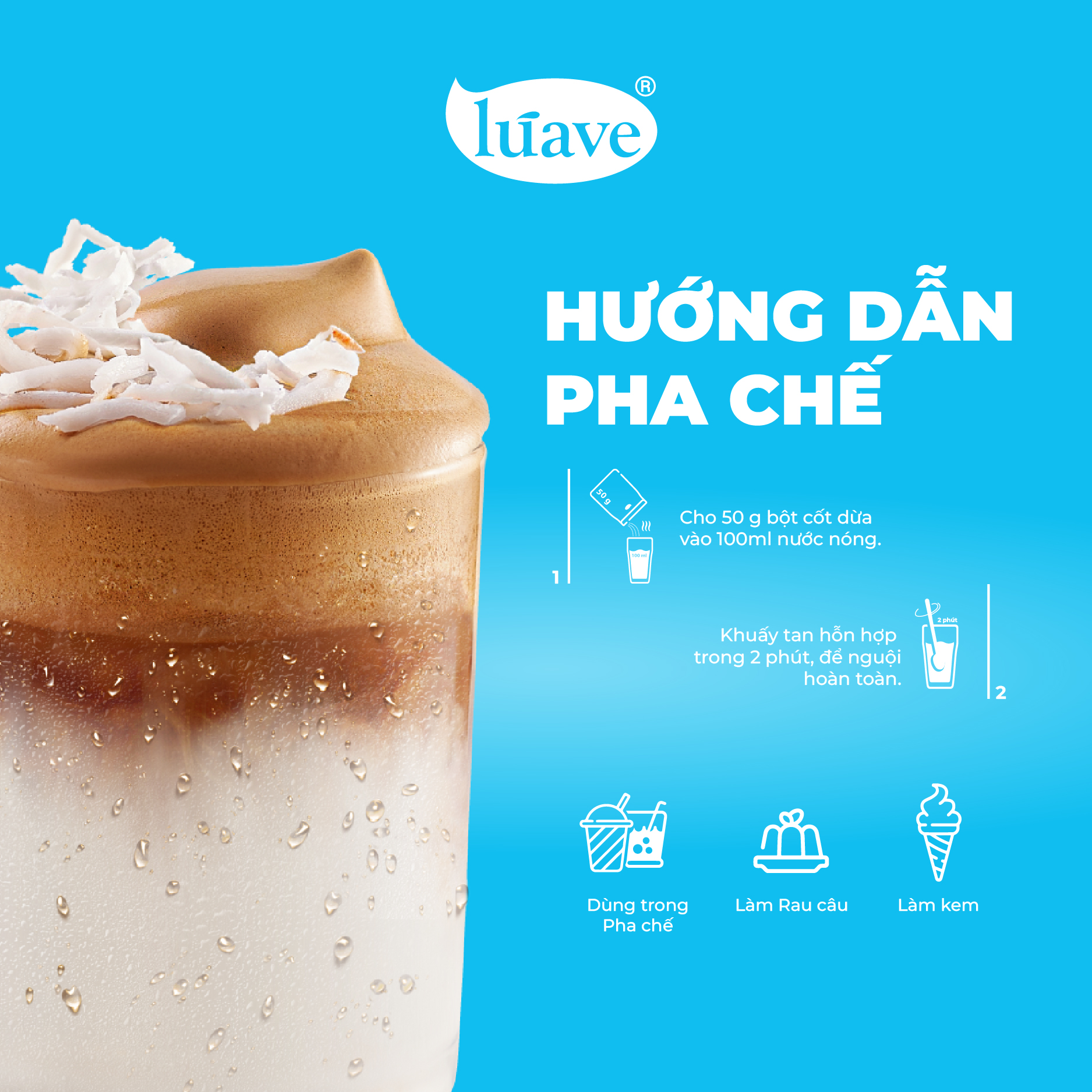 Bột cốt dừa Lúave được ứng dụng nhiều trong pha chế, nấu nướng, làm bánh,…
